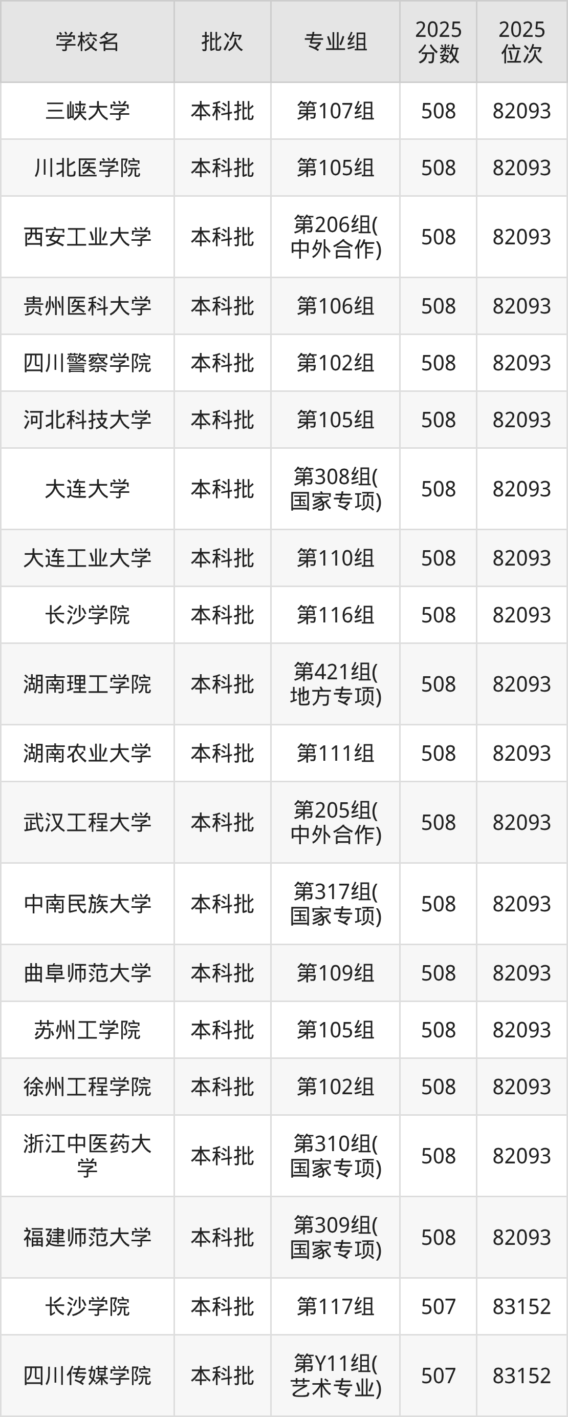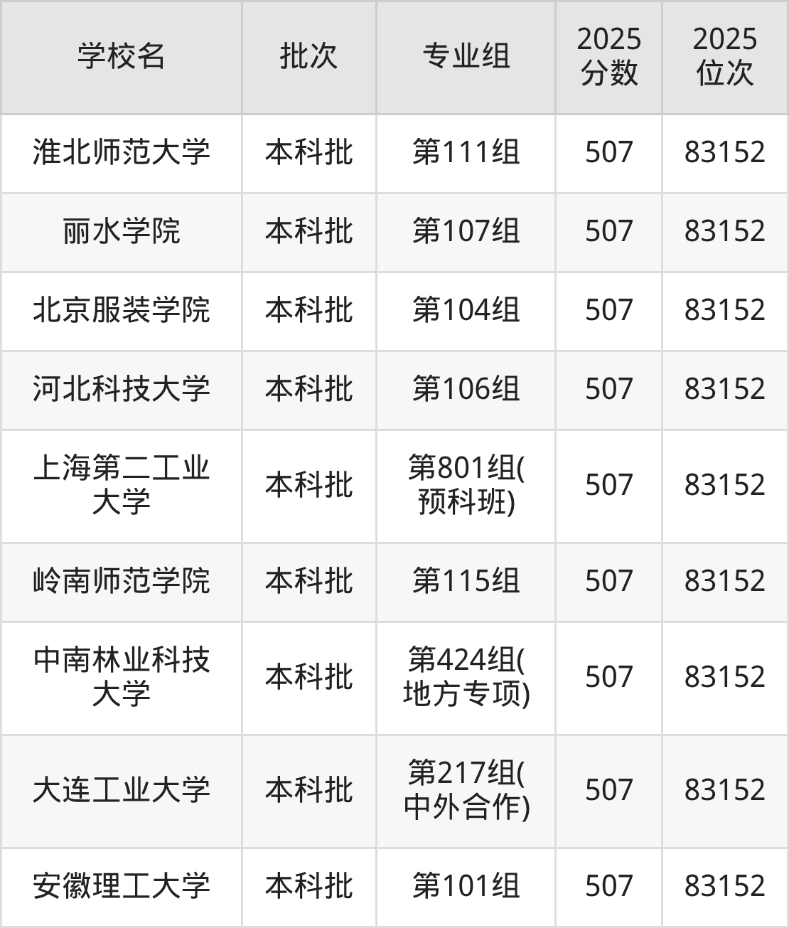 2025年湖南高考物理类507分(82094名~83152名)能上的大学有北京服装学院第104组、河北科技大学第106组、大连工业大学第217组(中外合作)、上海第二工业大学第801组(预科班)等。