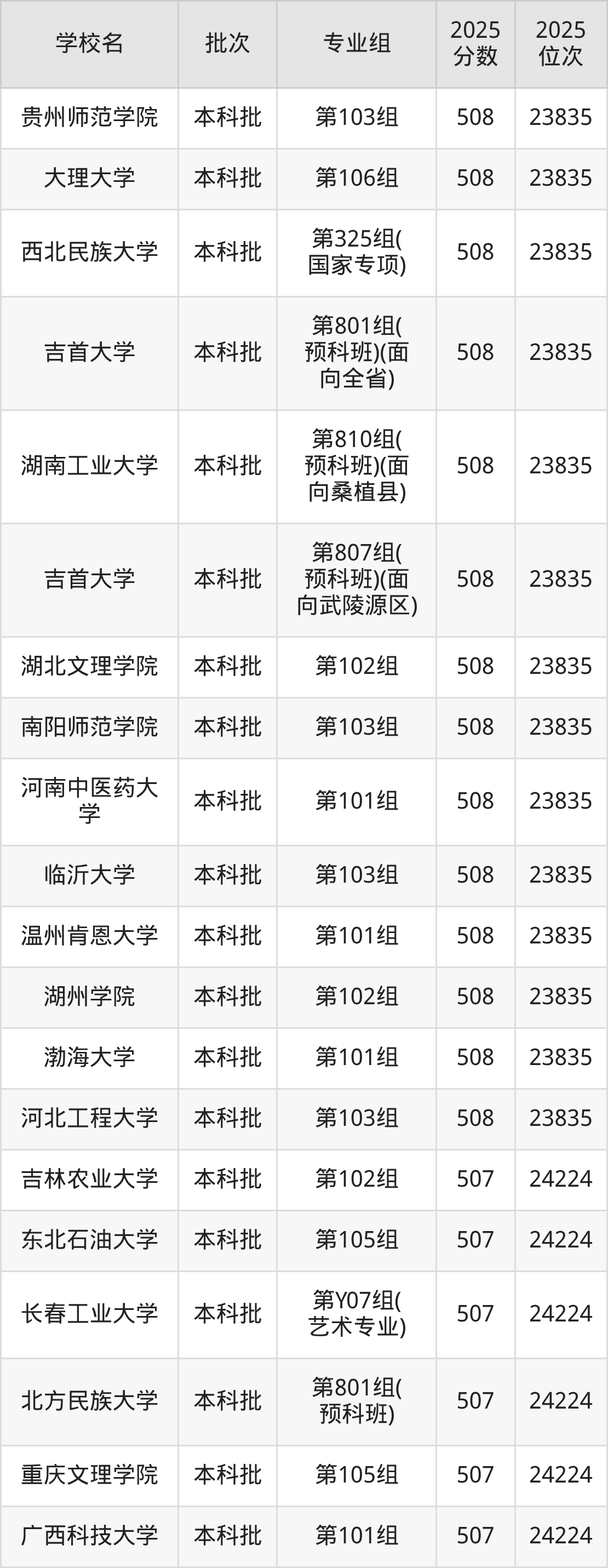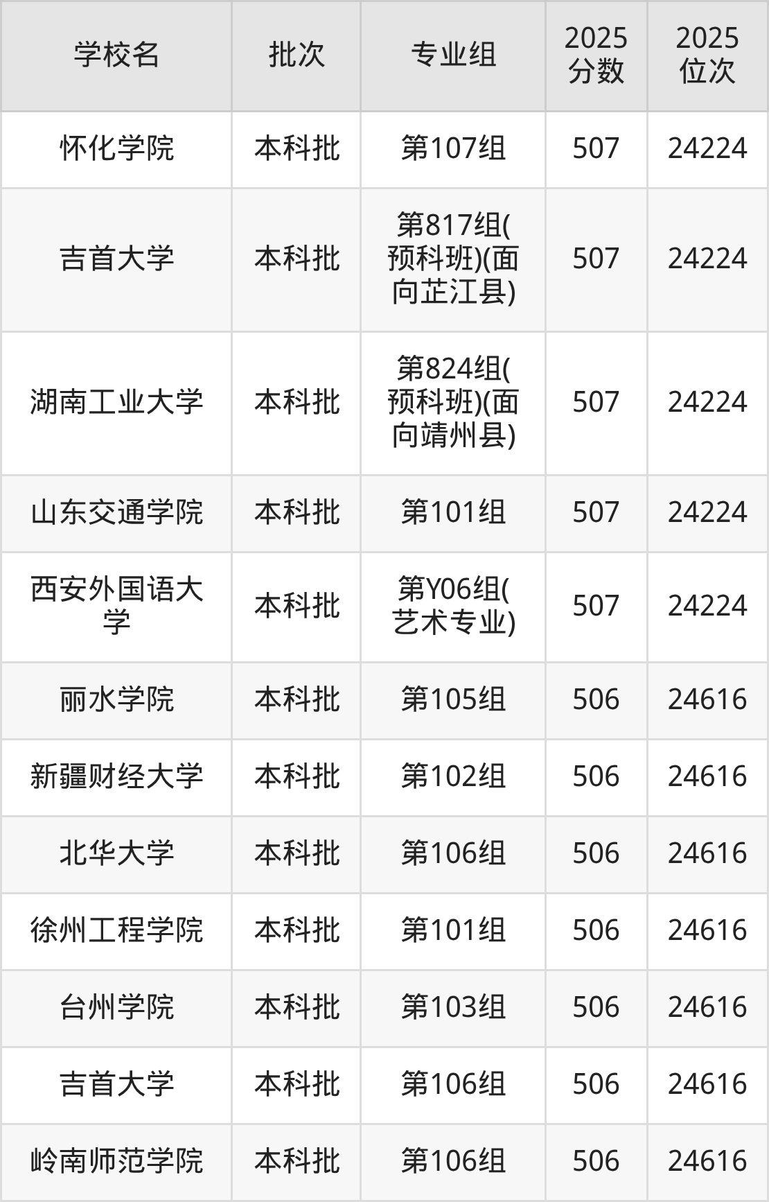 2025年湖南高考历史类507分(23836名~24224名)能上的大学有吉林农业大学第102组、东北石油大学第105组、山东交通学院第101组、湖南工业大学第824组(预科班)(面向靖州县)等。