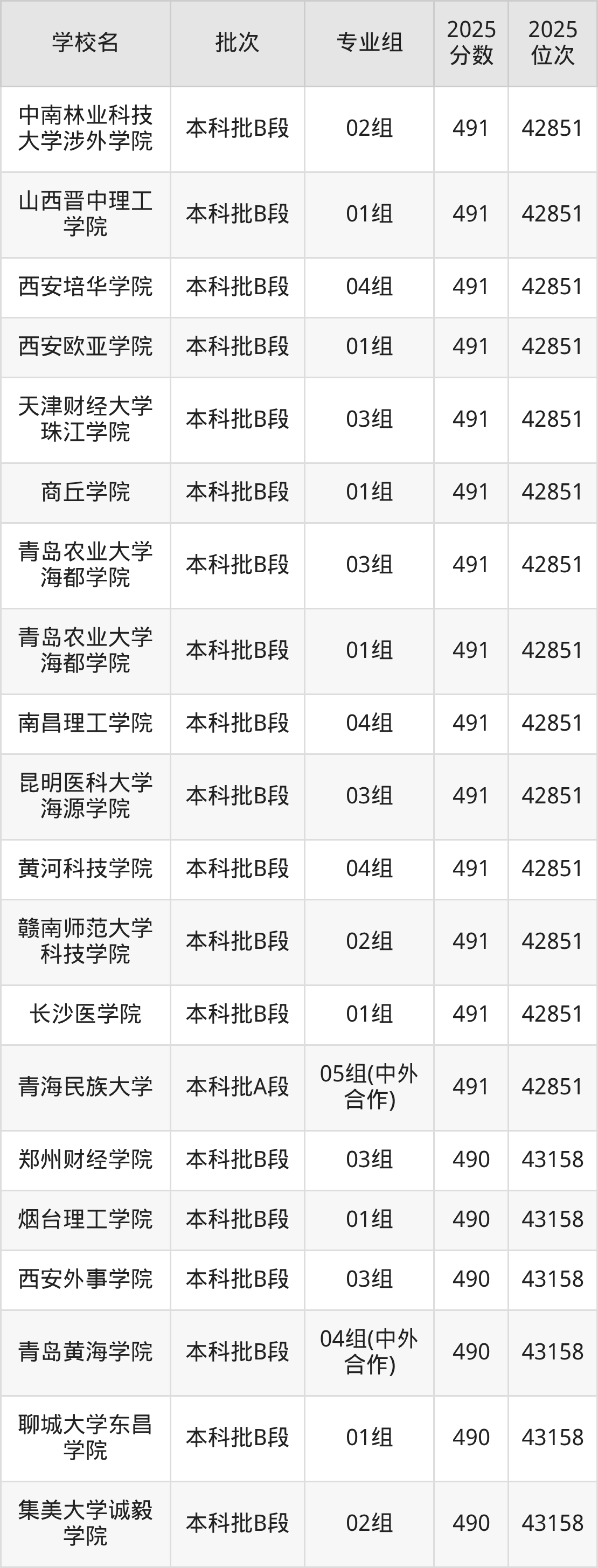 2025年天津高考491分(42550名~42851名)能上的大学有青海民族大学05组(中外合作)、长沙医学院01组、赣南师范大学科技学院02组、黄河科技学院04组等。