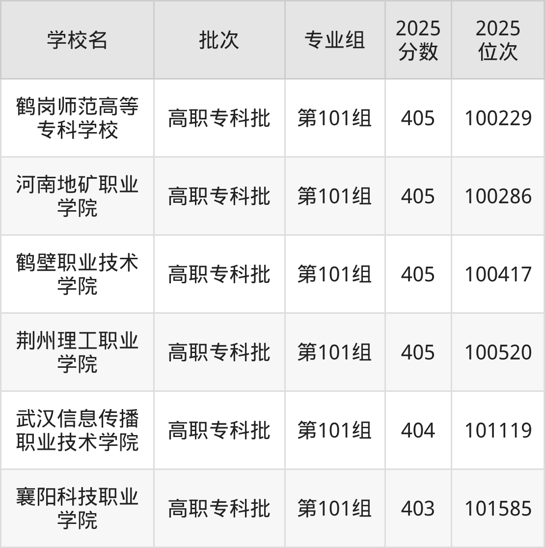 另外录取位次低于该区间(较稳妥)的有襄阳科技职业学院第101组(101585名)、湛江幼儿师范专科学校第101组(101902名)等;录取位次高于该区间(可冲)的有荆州理工职业学院第101组(100520名)、鹤壁职业技术学院第101组(100417名)等。