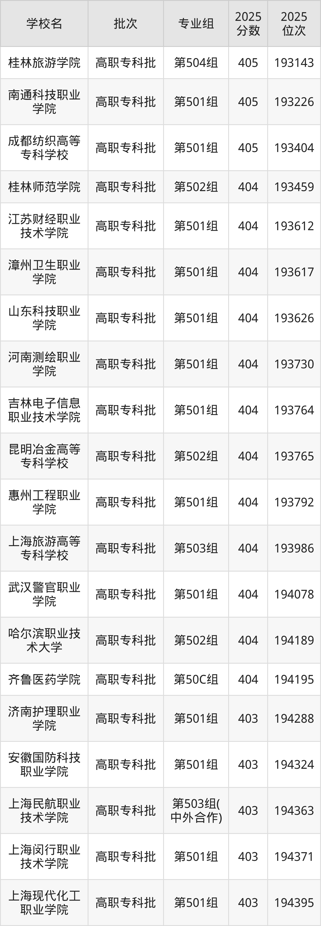 2025年江西高考物理类404分(193458名~194249名)能上的大学有上海旅游高等专科学校第503组、桂林师范学院第502组、昆明冶金高等专科学校第502组、吉林电子信息职业技术学院第501组等。