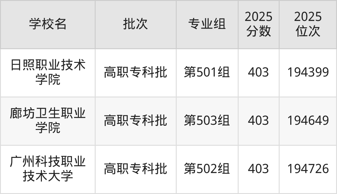 另外录取位次低于该区间(较稳妥)的有济南护理职业学院第501组(194288名)、安徽国防科技职业学院第501组(194324名)等;录取位次高于该区间(可冲)的有成都纺织高等专科学校第501组(193404名)、南通科技职业学院第501组(193226名)等。