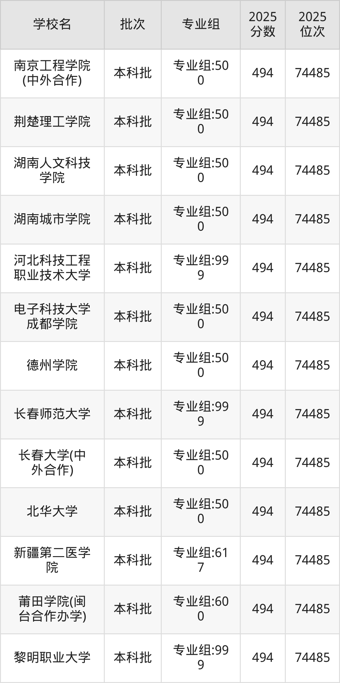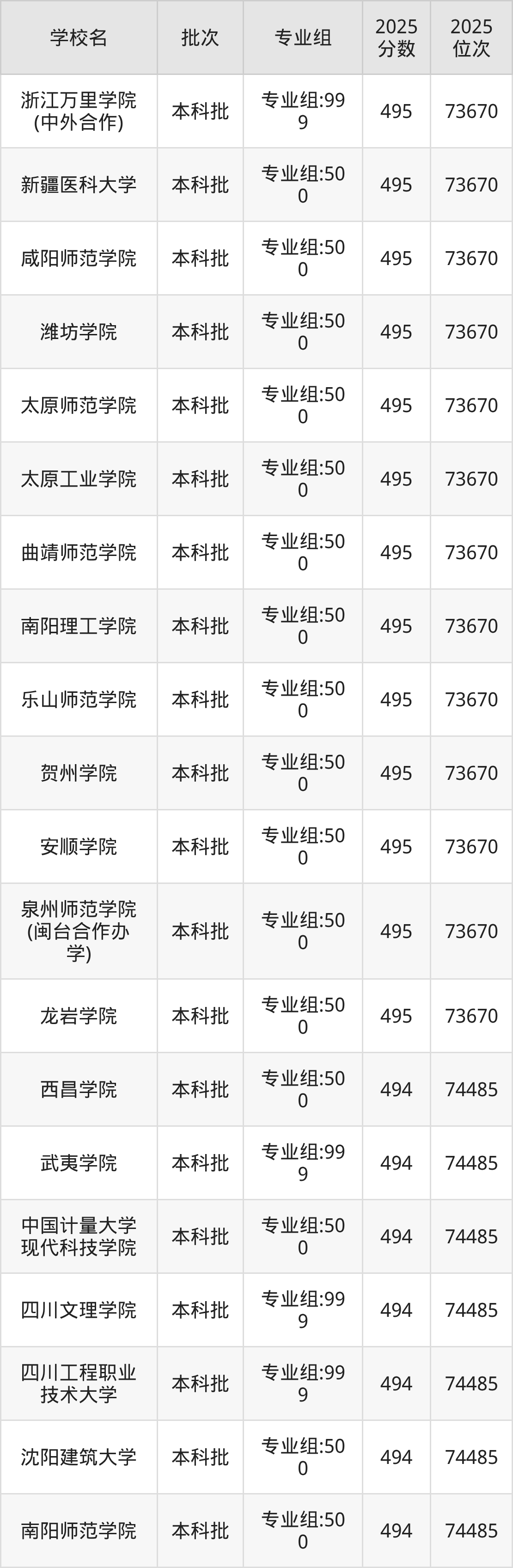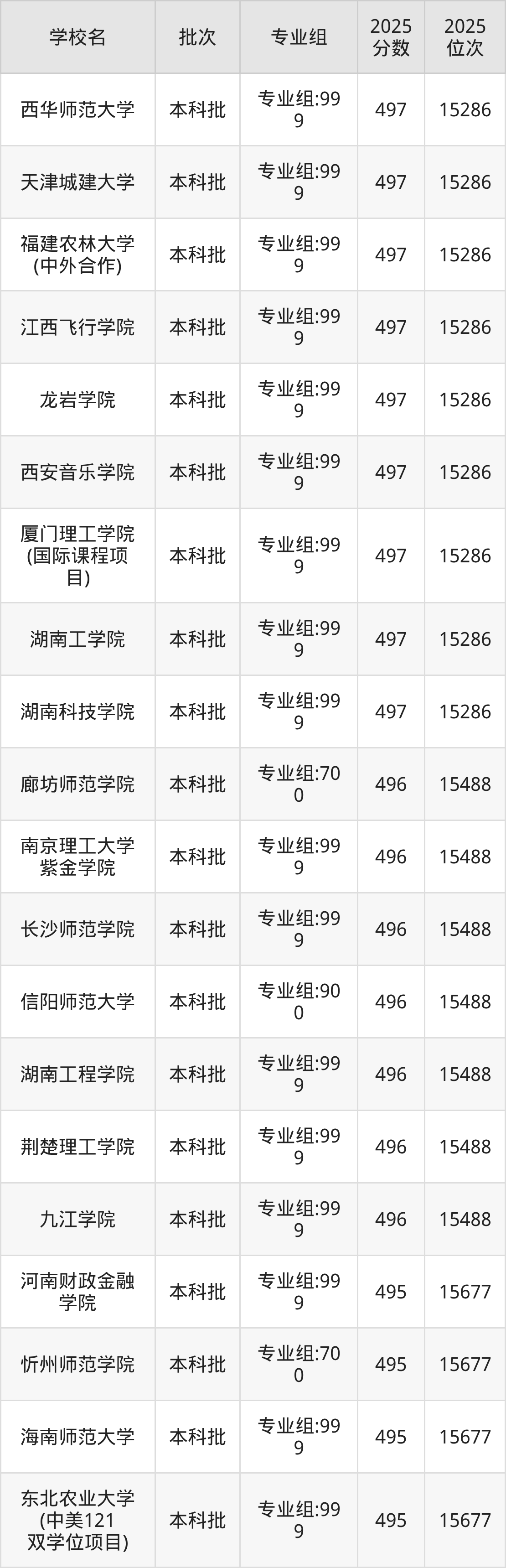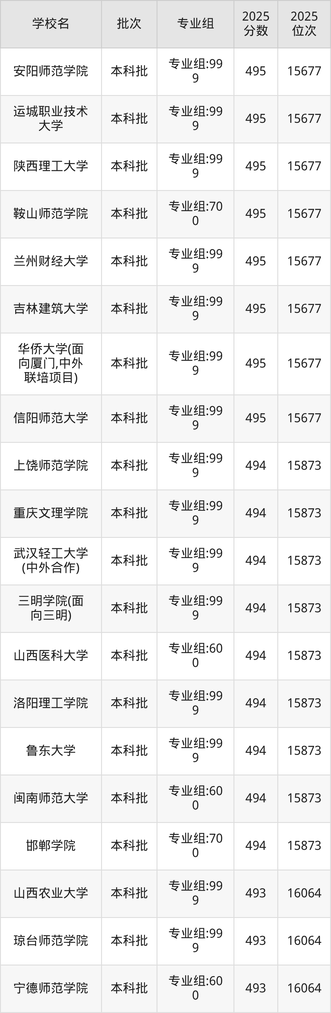 2025年福建高考历史类494分(15678名~15873名)能上的大学有闽南师范大学专业组:600、三明学院(面向三明)专业组:999、重庆文理学院专业组:999、邯郸学院专业组:700等。