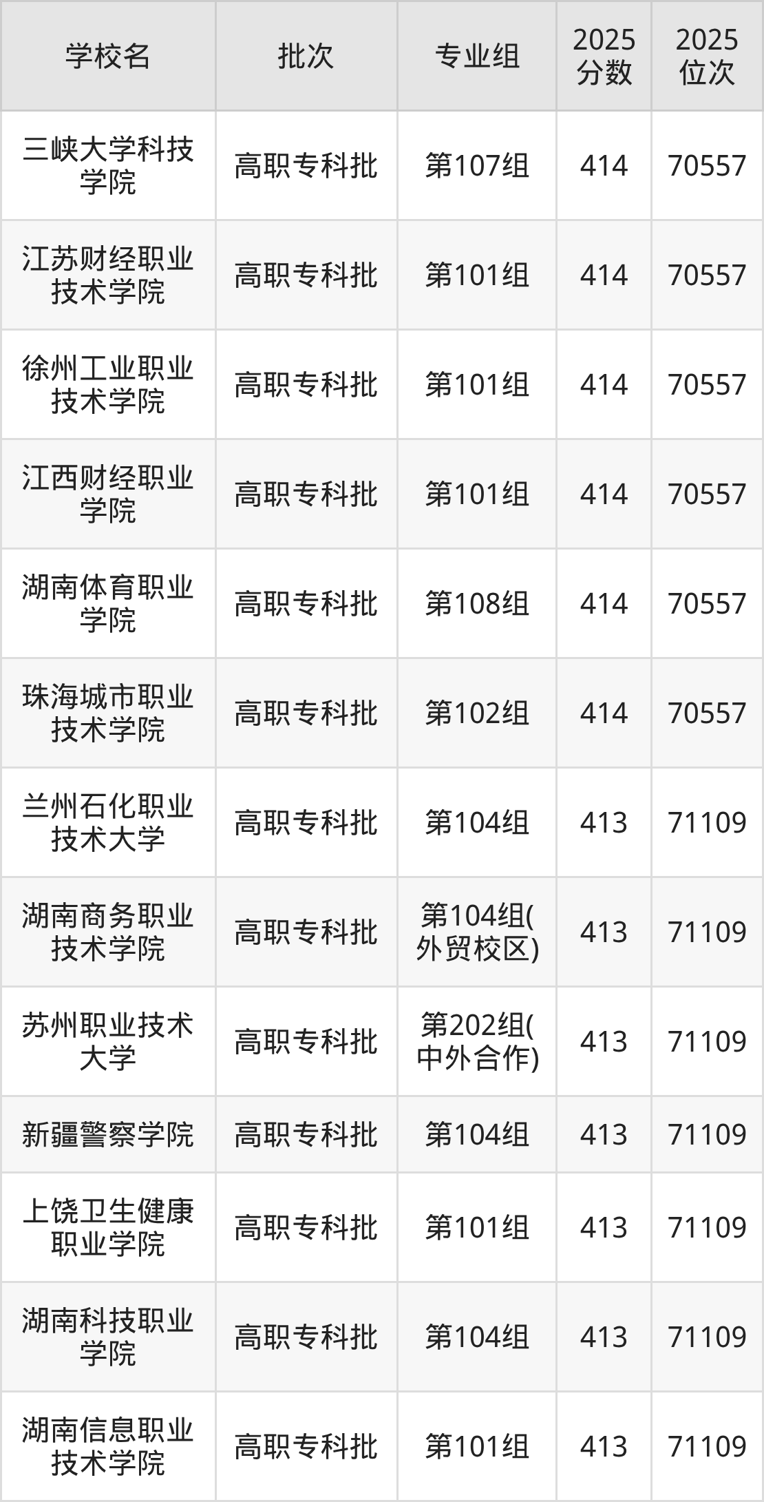 2025年湖南高考历史类413分(70558名~71109名)能上的大学有上饶卫生健康职业学院第101组、湖南科技职业学院第104组、湖南信息职业技术学院第101组、湖南商务职业技术学院第104组(外贸校区)等。