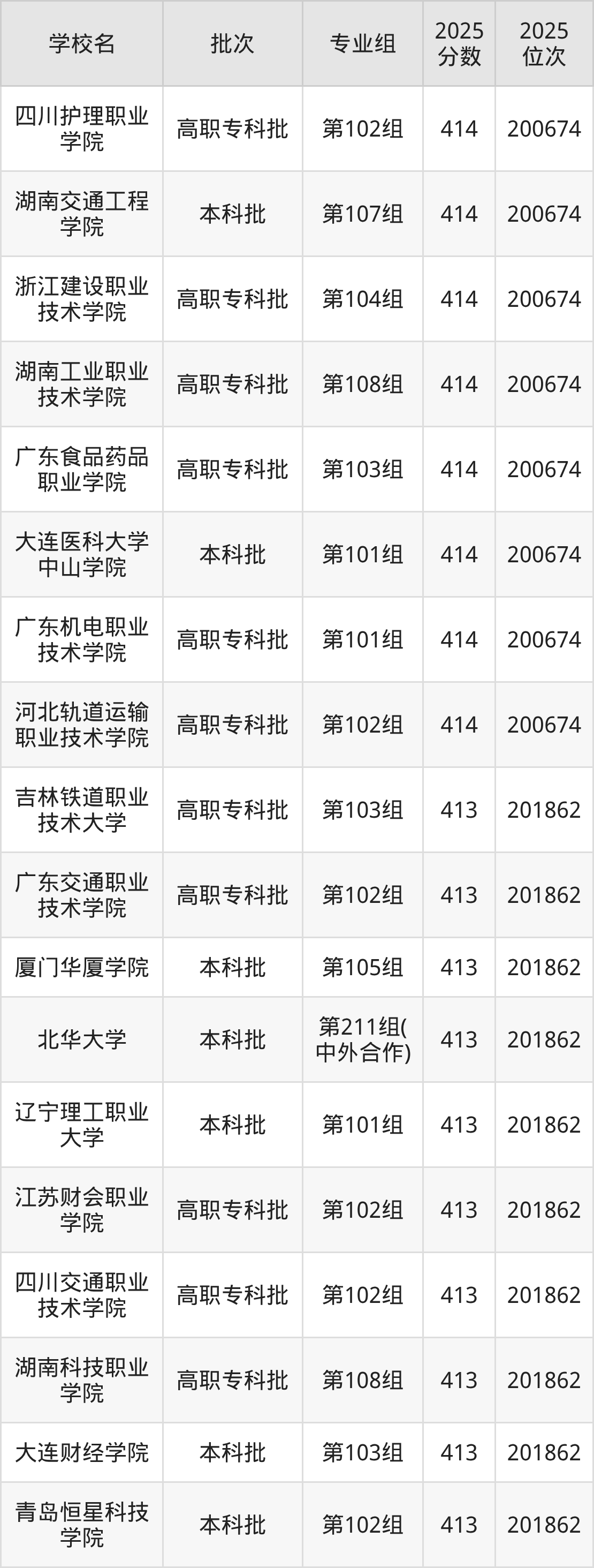 湖南高考413分:历史类排名71109位、物理类排名201862位。该分数位次对应能上的大学历史类有上饶卫生健康职业学院第101组、湖南科技职业学院第104组;物理类有大连财经学院第103组、辽宁理工职业大学第101组,更多名单如下文所示,2026届考生可参考。