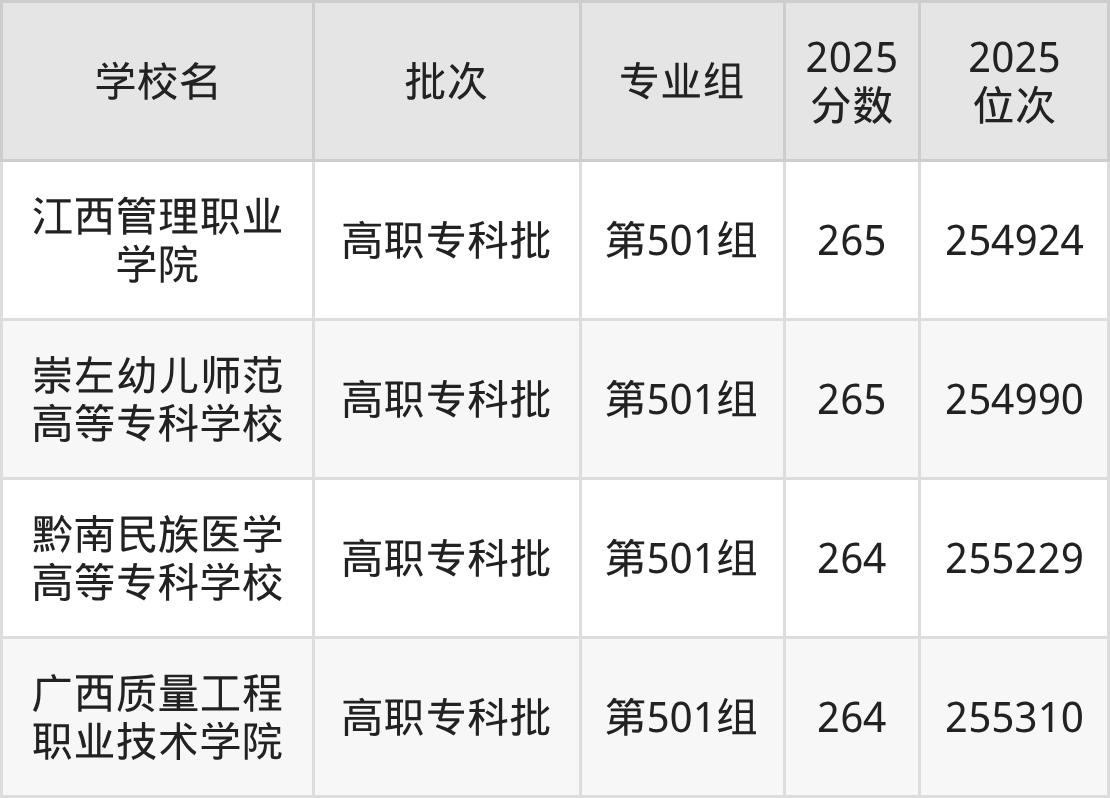 2025年江西高考历史类263分(187743名~188102名)录取位次高于该区间(可冲)的有广东创新科技职业学院第101组(177218名)、重庆安防职业学院第101组(177218名)等。