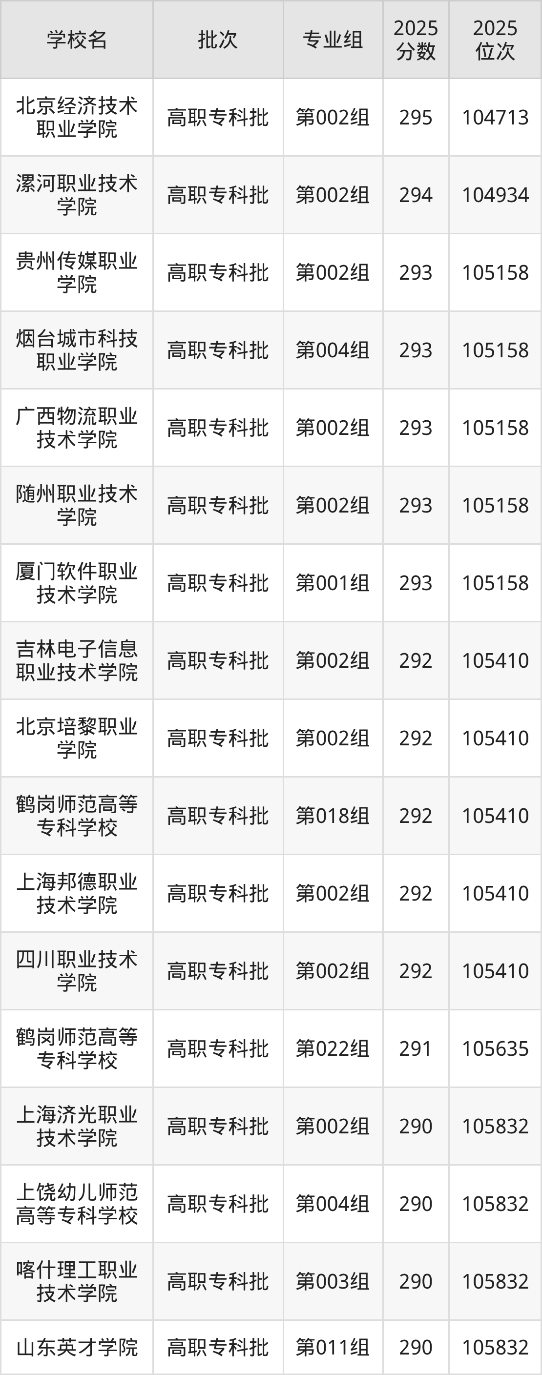2025年黑龙江高考物理类292分(105159名~105410名)能上的大学有北京培黎职业学院第002组、吉林电子信息职业技术学院第002组、鹤岗师范高等专科学校第018组、上海邦德职业技术学院第002组等。