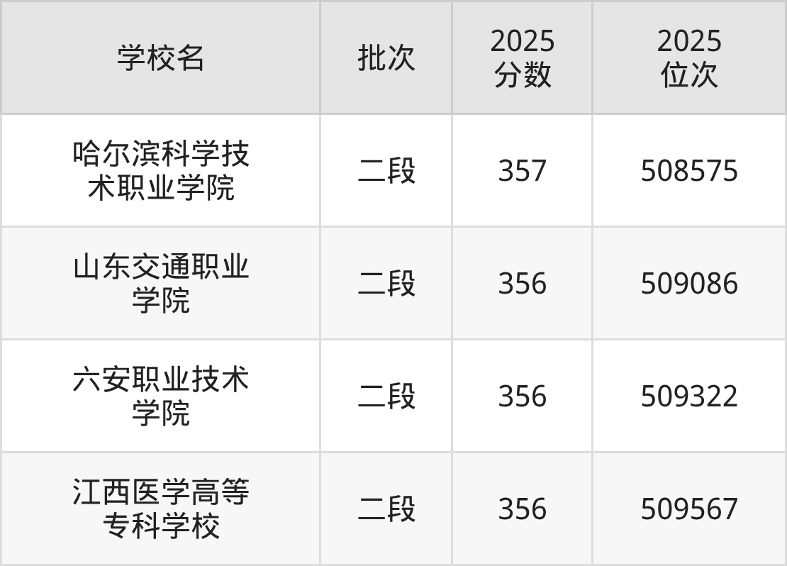 2025年山东高考356分(508646名~510446名)能上的大学有六安职业技术学院、江西医学高等专科学校、山东交通职业学院。