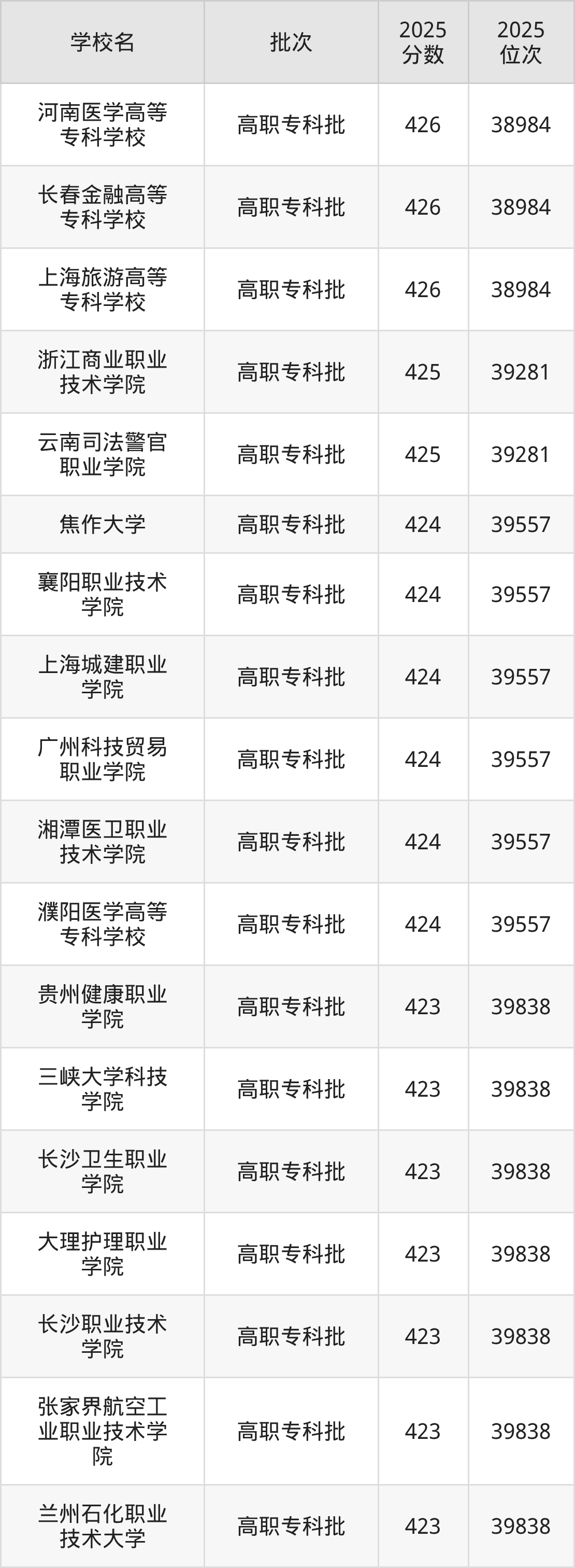 2025年重庆高考历史类424分(39282名~39557名)能上的大学有襄阳职业技术学院、广州科技贸易职业学院、湘潭医卫职业技术学院、濮阳医学高等专科学校等。