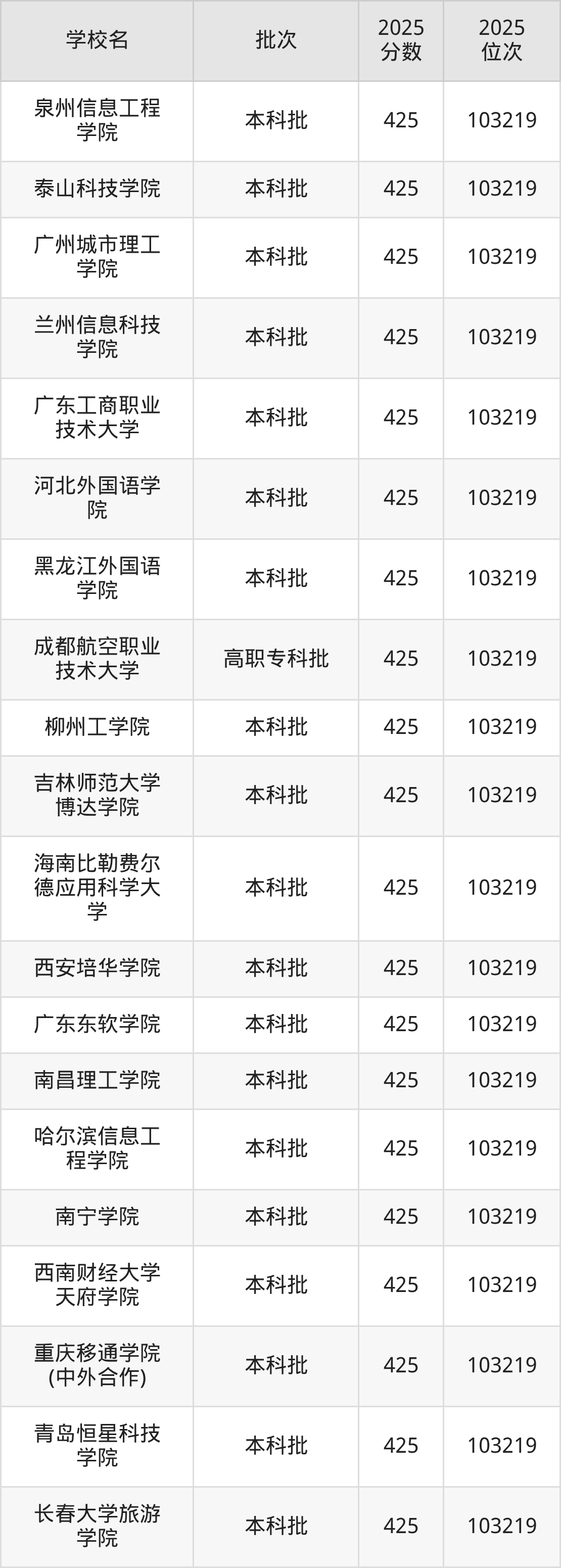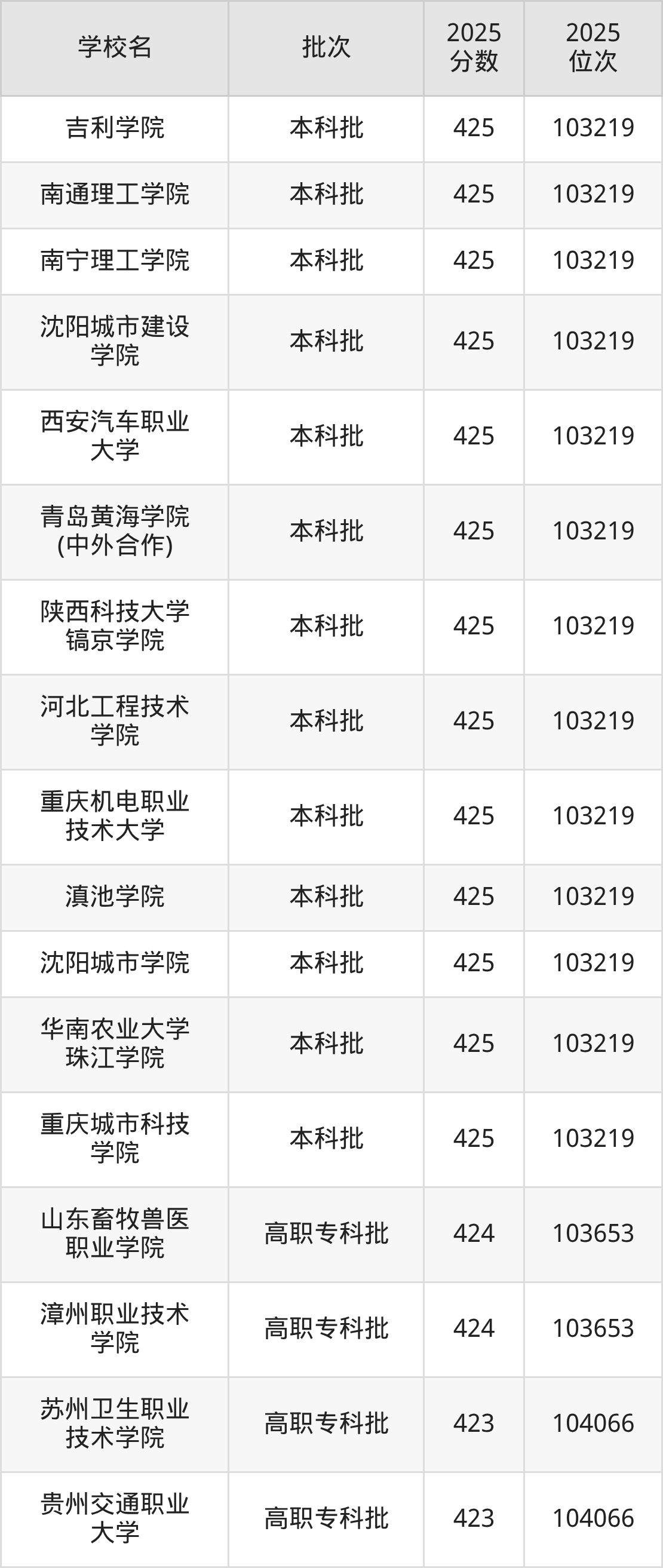 2025年重庆高考物理类424分(103220名~103653名)能上的大学有漳州职业技术学院、山东畜牧兽医职业学院。
