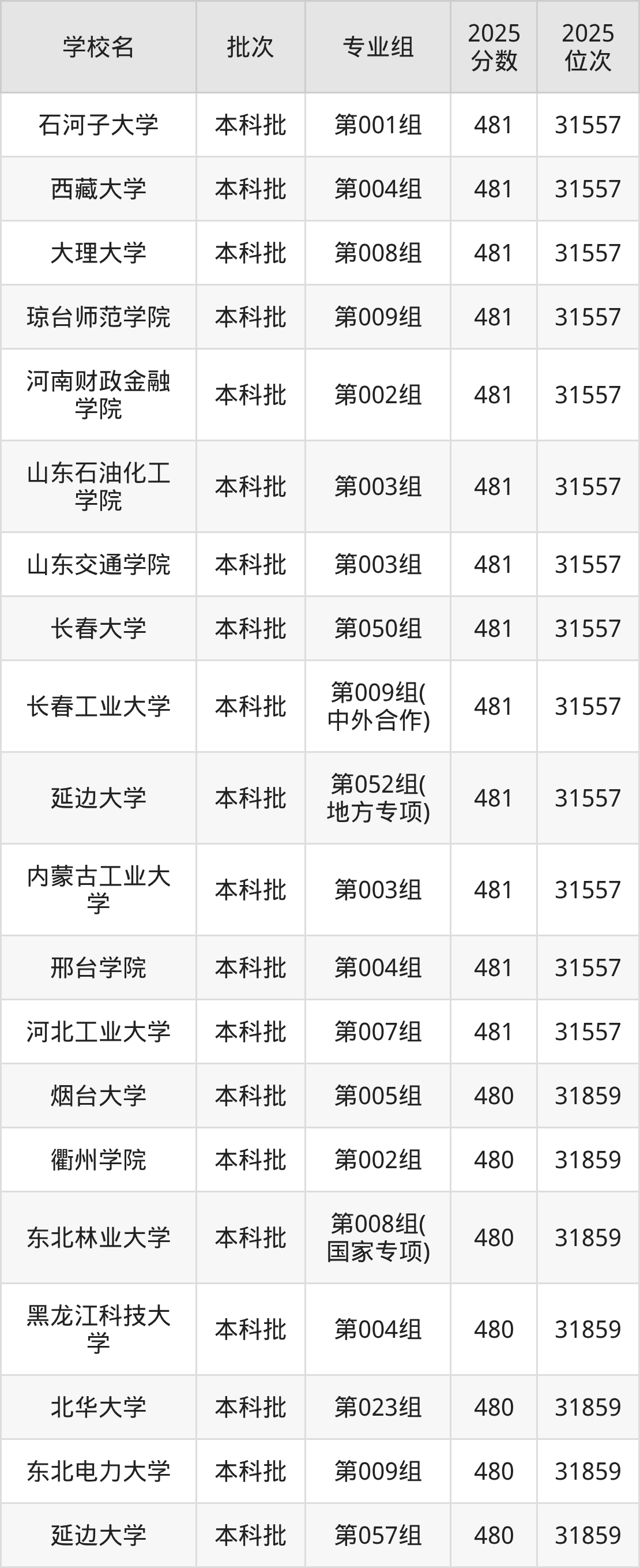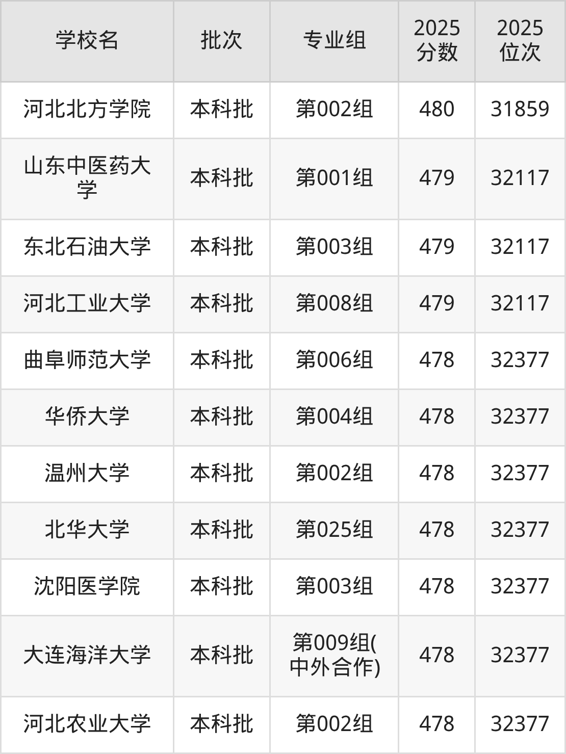 2025年吉林高考物理类479分(31860名~32117名)能上的大学有河北工业大学第008组、东北石油大学第003组、山东中医药大学第001组。