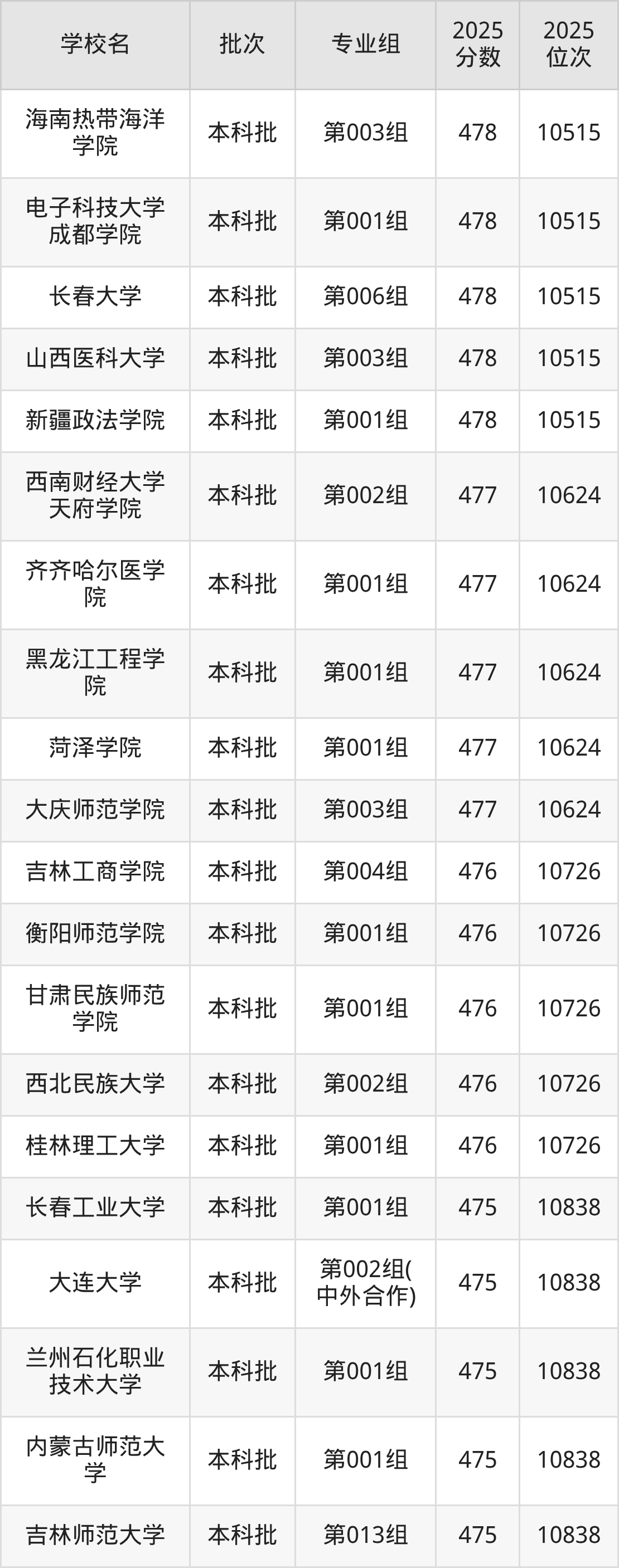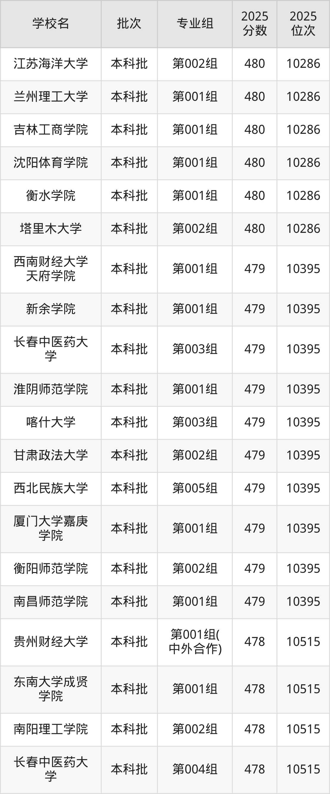 2025年吉林高考历史类479分(10287名~10395名)能上的大学有长春中医药大学第003组、淮阴师范学院第001组、厦门大学嘉庚学院第001组、新余学院第001组等。