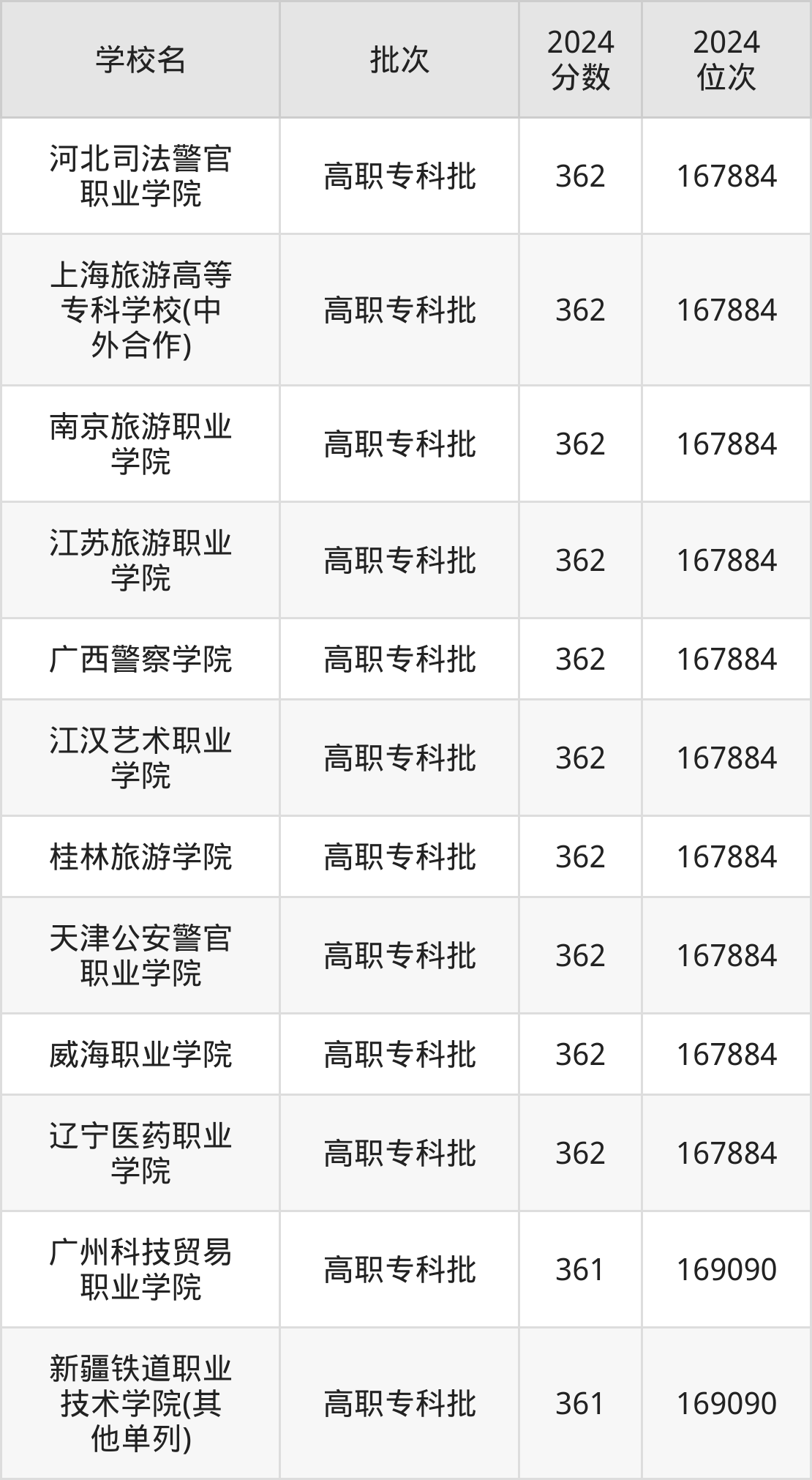 2024年河南高考文科361分(167885名~169090名)能上的大学有广州科技贸易职业学院、新疆铁道职业技术学院(其他单列)。