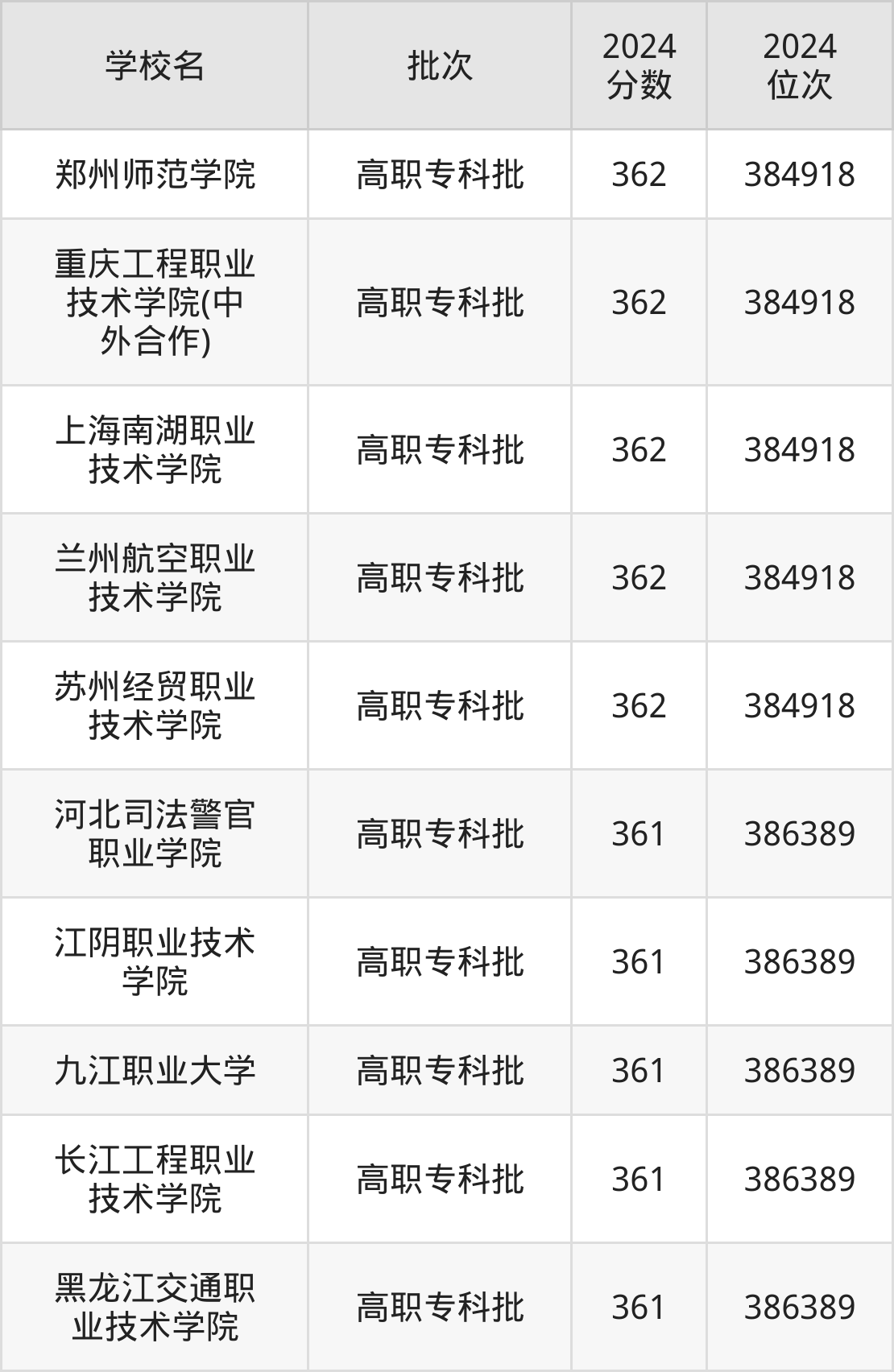 2024年河南高考理科361分(384920名~386390名)能上的大学有黑龙江交通职业技术学院、长江工程职业技术学院、九江职业大学、江阴职业技术学院等。