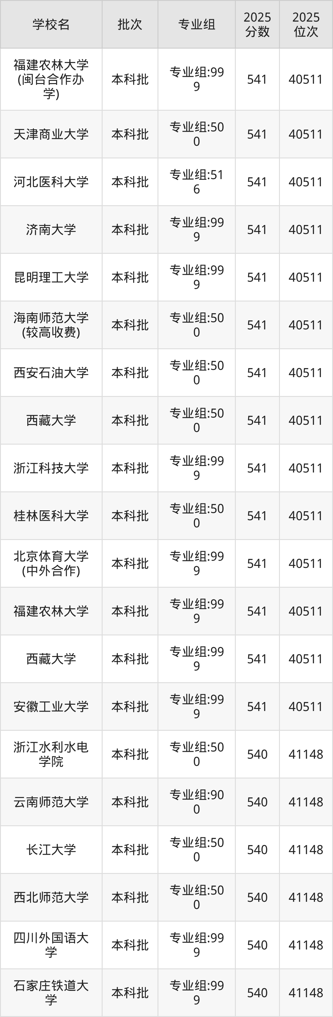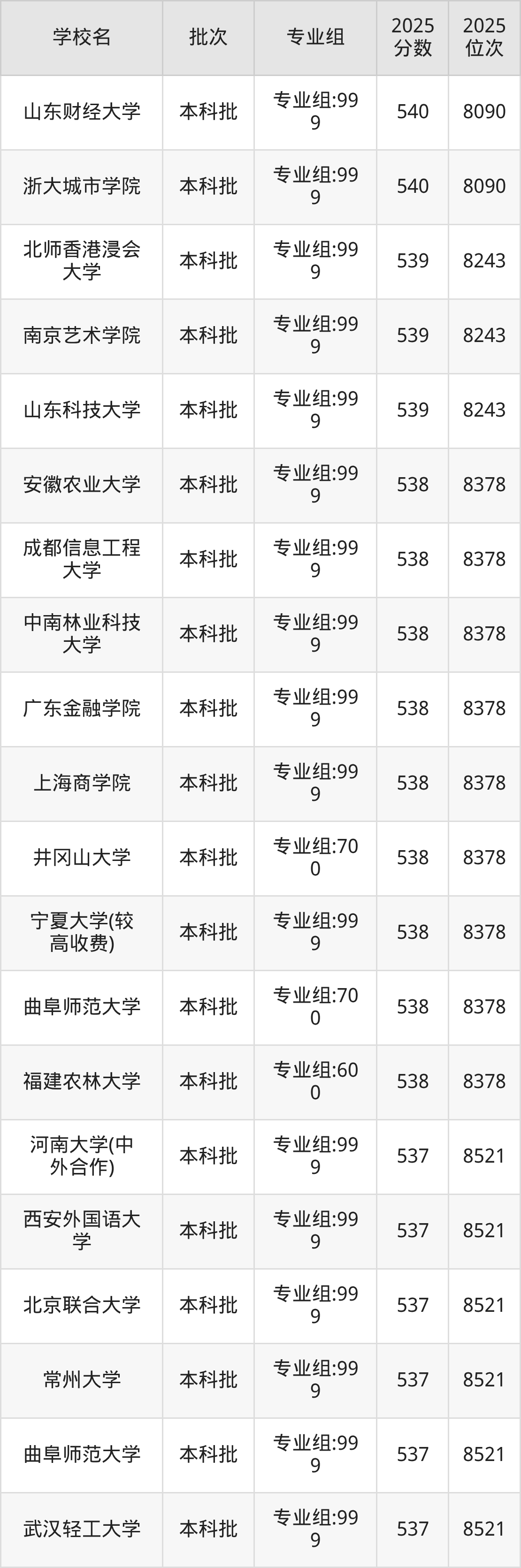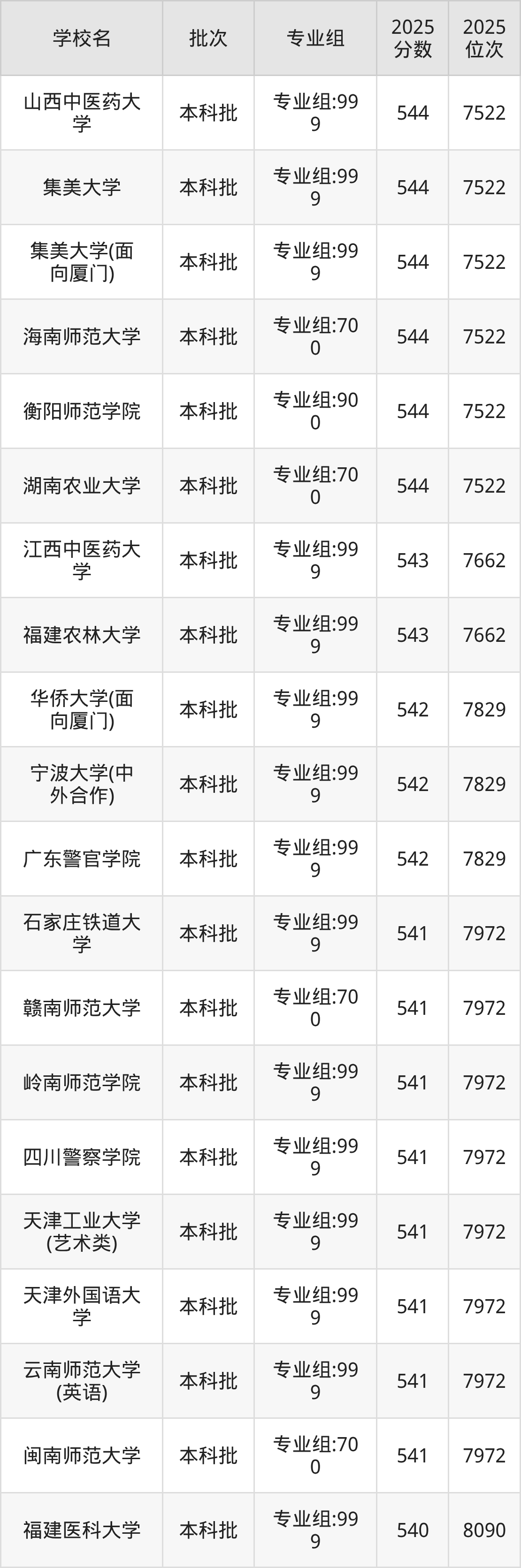 2025年福建高考历史类540分(7973名~8090名)能上的大学有福建医科大学专业组:999、山东财经大学专业组:999、浙大城市学院专业组:999。