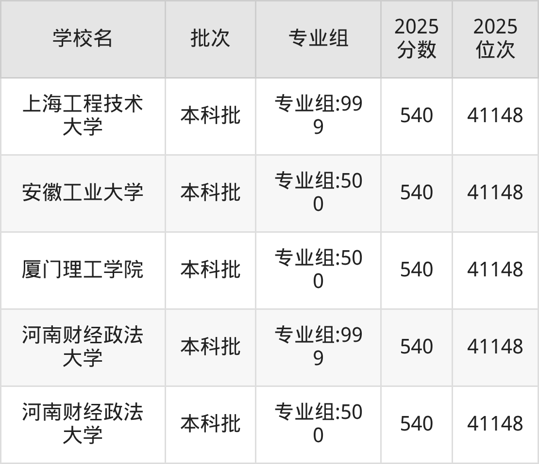 2025年福建高考物理类540分(40512名~41148名)能上的大学有厦门理工学院专业组:500、安徽工业大学专业组:500、长江大学专业组:500、河南财经政法大学专业组:500等。