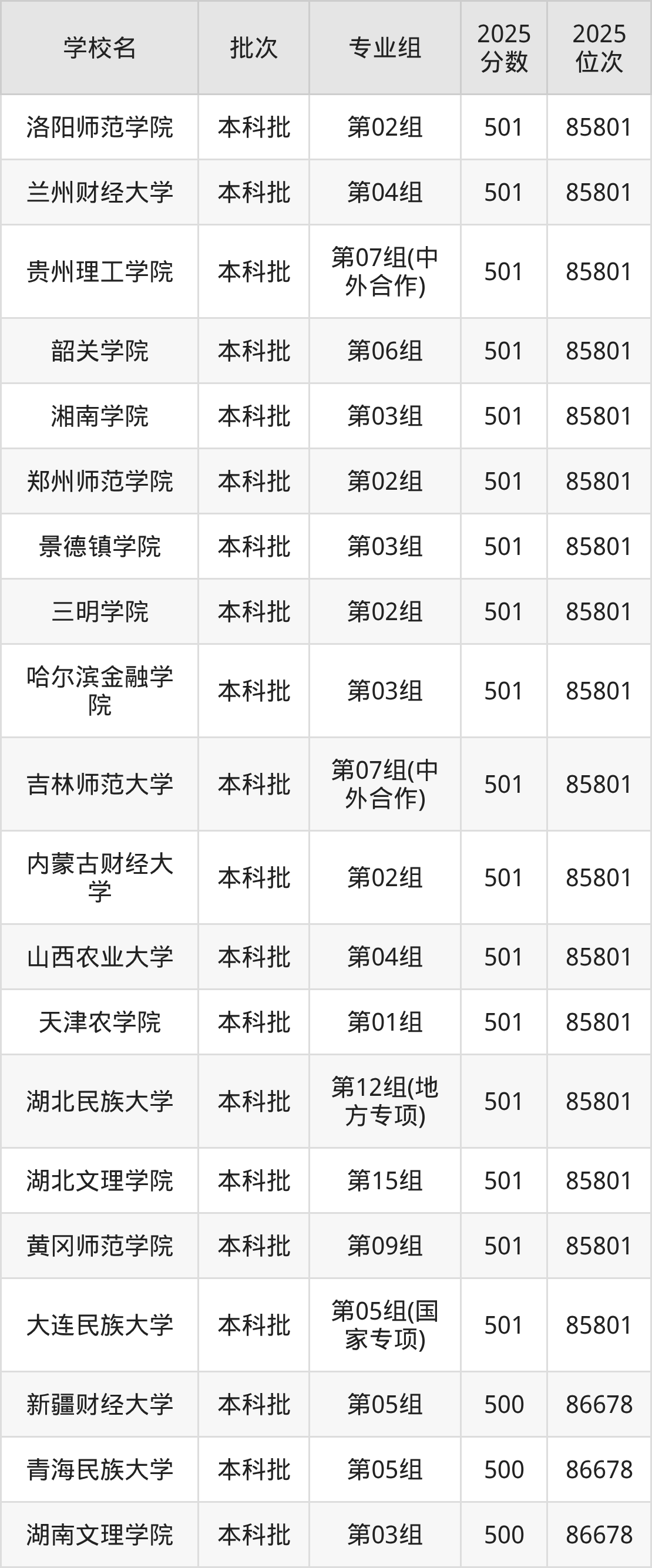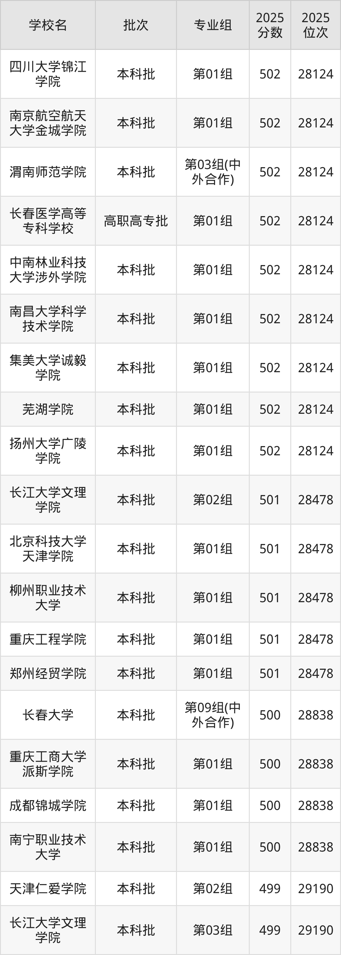 2025年湖北高考历史类500分(28479名~28838名)能上的大学有长春大学第09组(中外合作)、重庆工商大学派斯学院第01组、成都锦城学院第01组、南宁职业技术大学第01组。