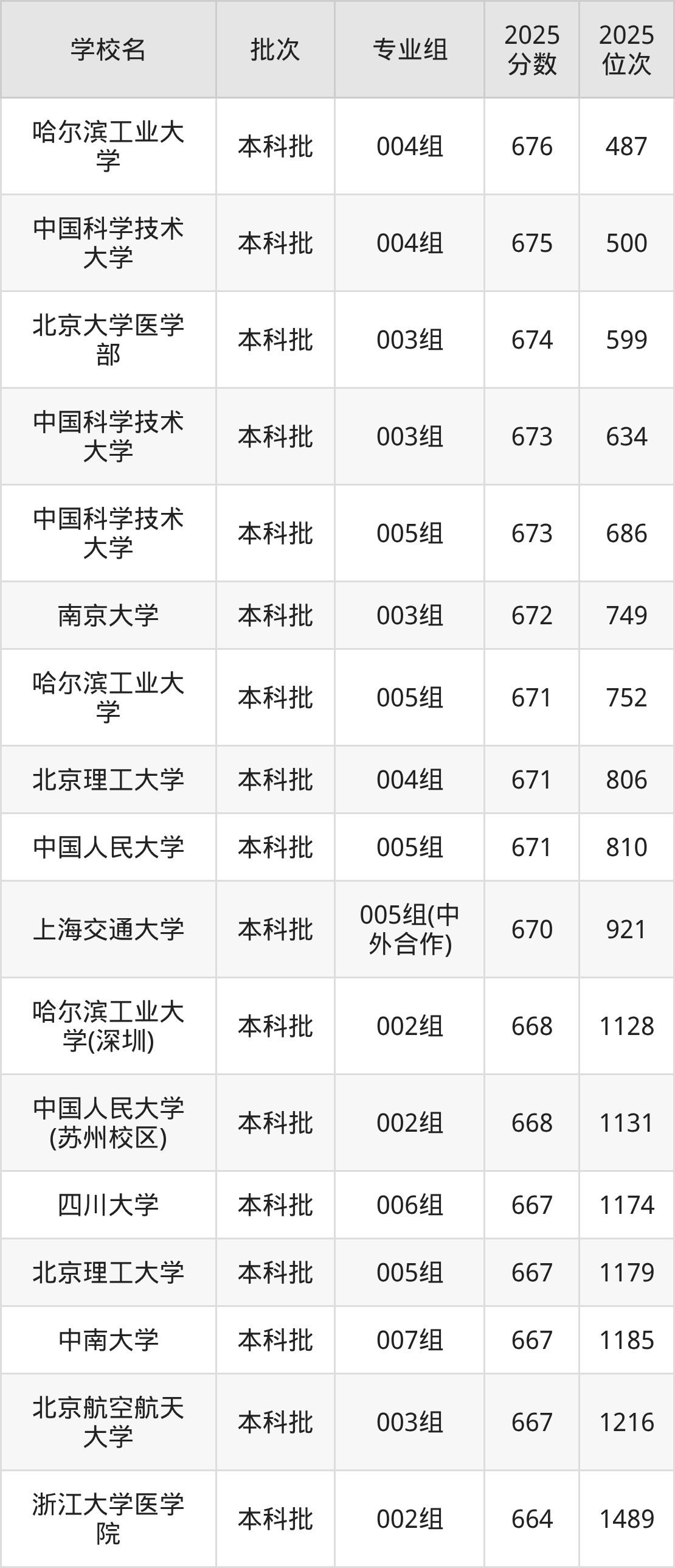2025年安徽高考物理类669分(925名~1020名)录取位次低于该区间(较稳妥)的有哈尔滨工业大学(深圳)002组(1128名)、中国人民大学(苏州校区)002组(1131名)等;录取位次高于该区间(可冲)的有上海交通大学005组(中外合作)(921名)、中国人民大学005组(810名)等。