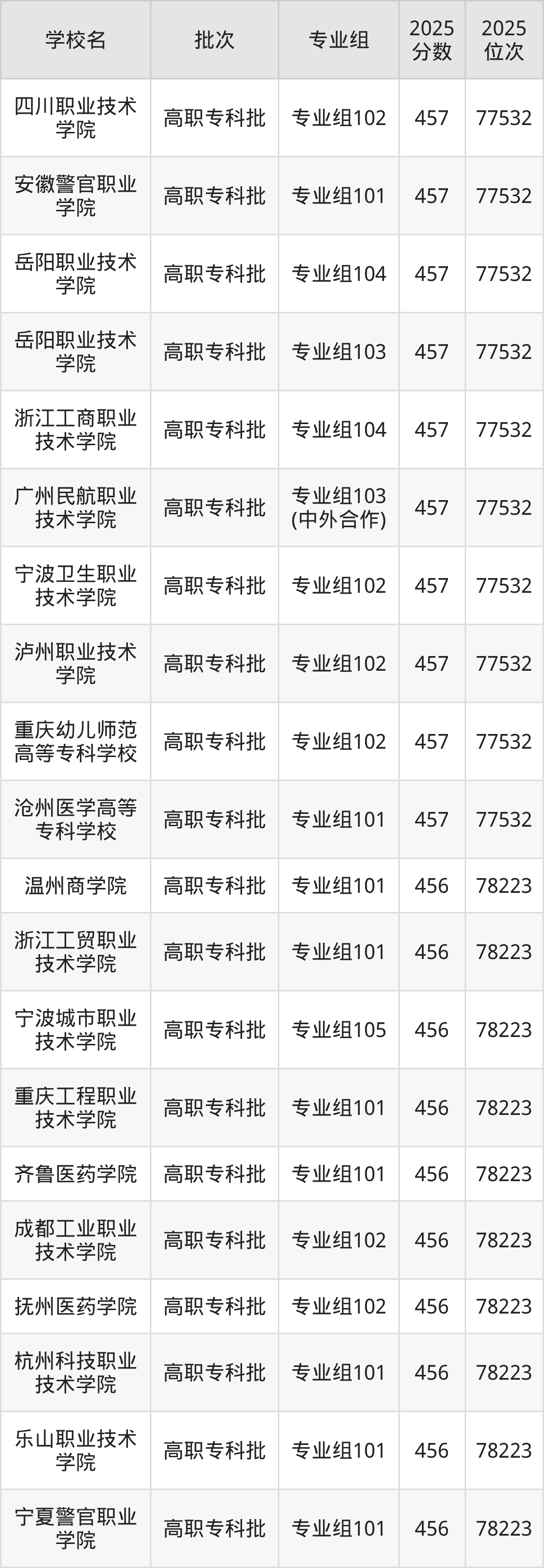 2025年四川高考历史类456分(77533名~78223名)能上的大学有宁波城市职业技术学院专业组105、重庆工程职业技术学院专业组101、齐鲁医药学院专业组101、温州商学院专业组101等。