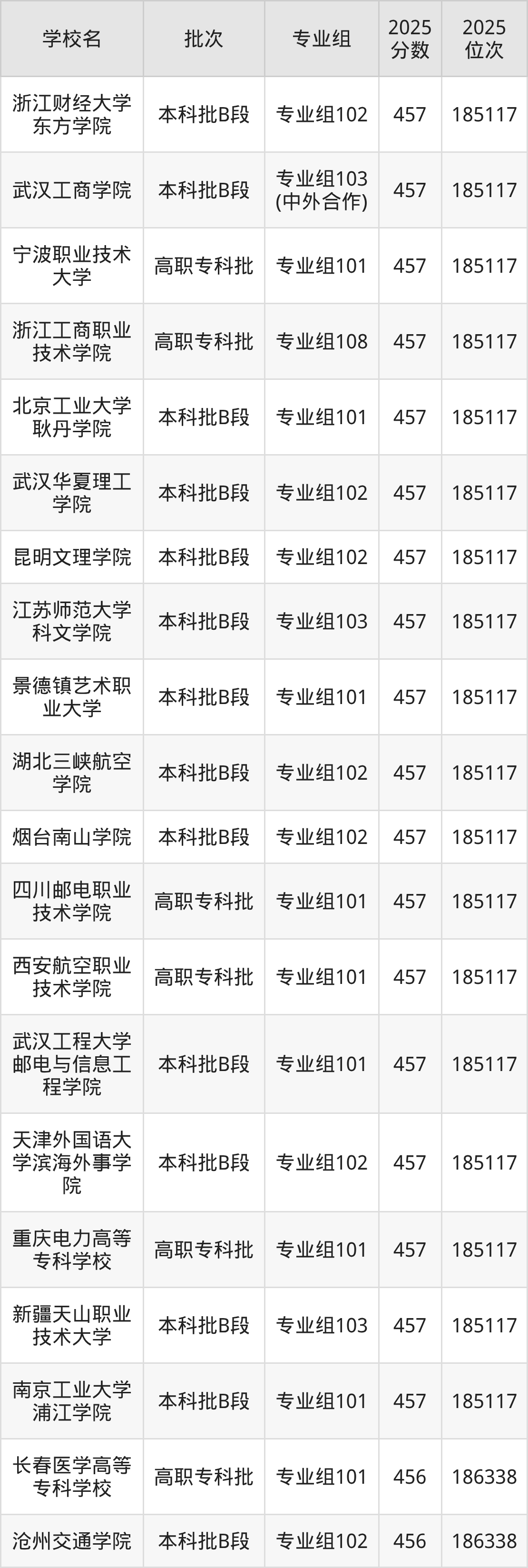 另外录取位次低于该区间(较稳妥)的有重庆外语外事学院专业组102(187568名)、山东英才学院专业组104(187568名)等;录取位次高于该区间(可冲)的有南京工业大学浦江学院专业组101(185117名)、新疆天山职业技术大学专业组103(185117名)等。