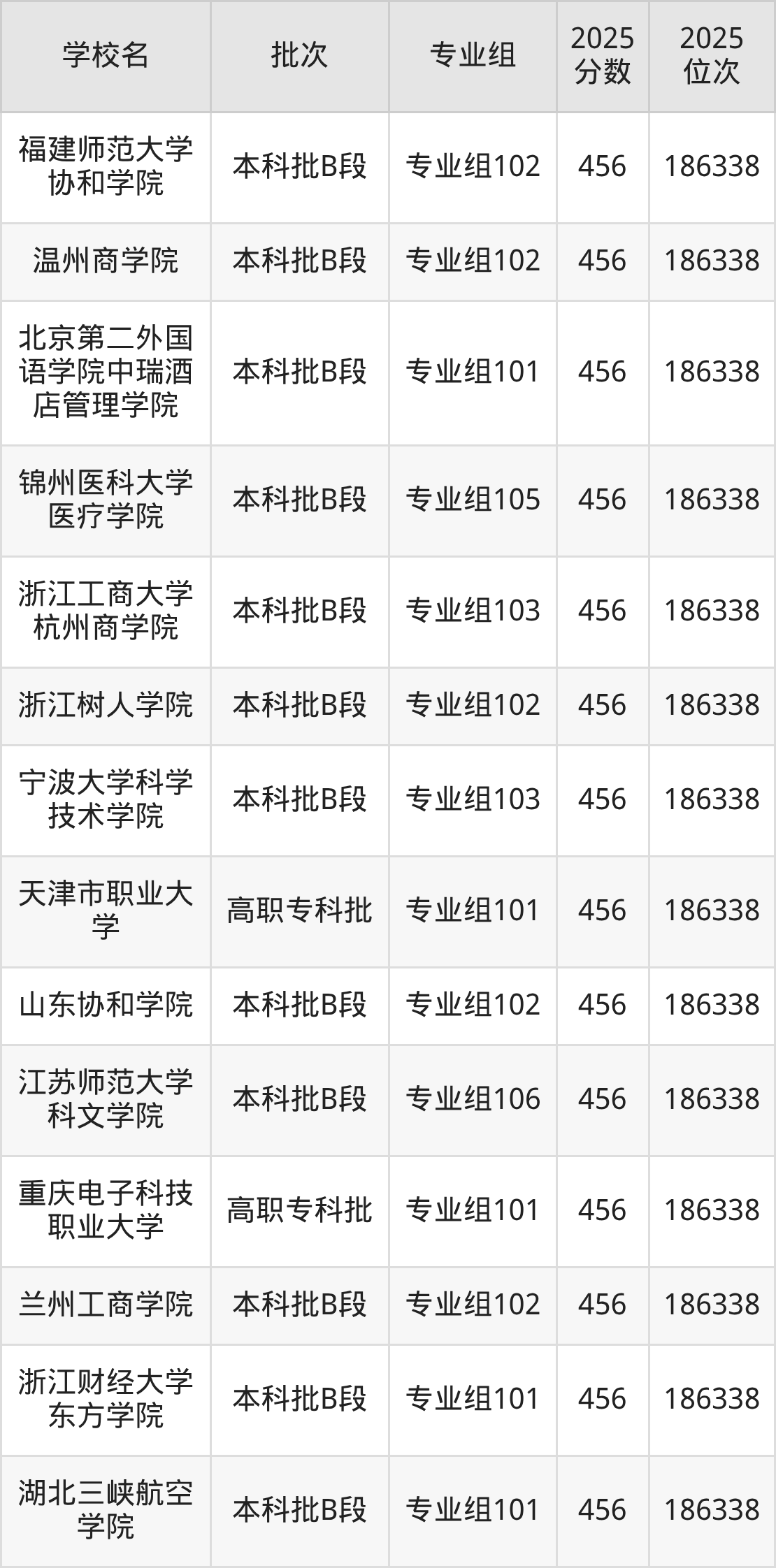 2025年四川高考物理类456分(185118名~186338名)能上的大学有福建师范大学协和学院专业组102、温州商学院专业组102、北京第二外国语学院中瑞酒店管理学院专业组101、锦州医科大学医疗学院专业组105等。