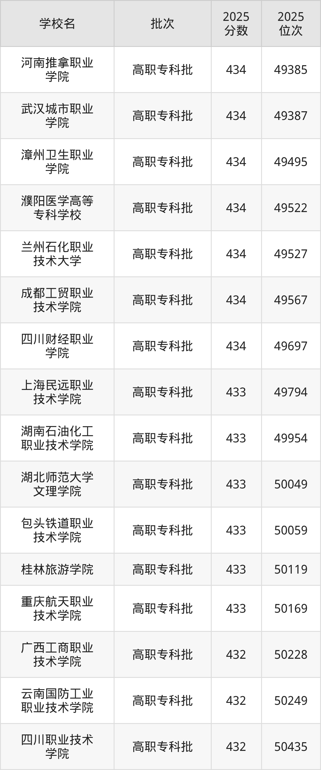 2025年贵州高考历史类433分(49760名~50211名)能上的大学有湖南石油化工职业技术学院、湖北师范大学文理学院、重庆航天职业技术学院、包头铁道职业技术学院等。