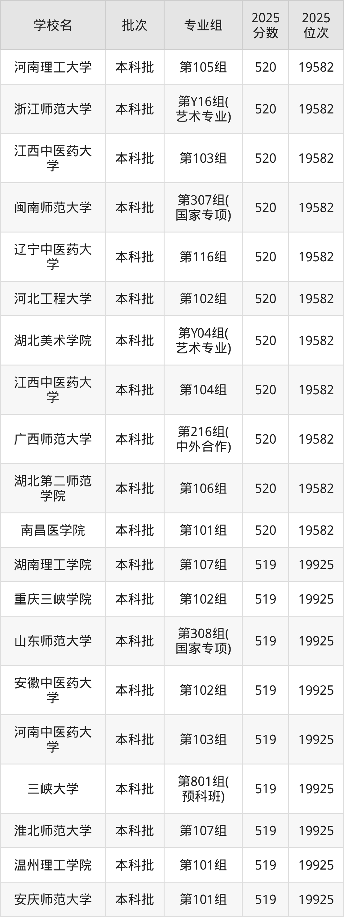 另外录取位次低于该区间(较稳妥)的有武汉商学院第103组(20592名)、西华师范大学第104组(20592名)等;录取位次高于该区间(可冲)的有重庆三峡学院第102组(19925名)、湖南理工学院第107组(19925名)等。