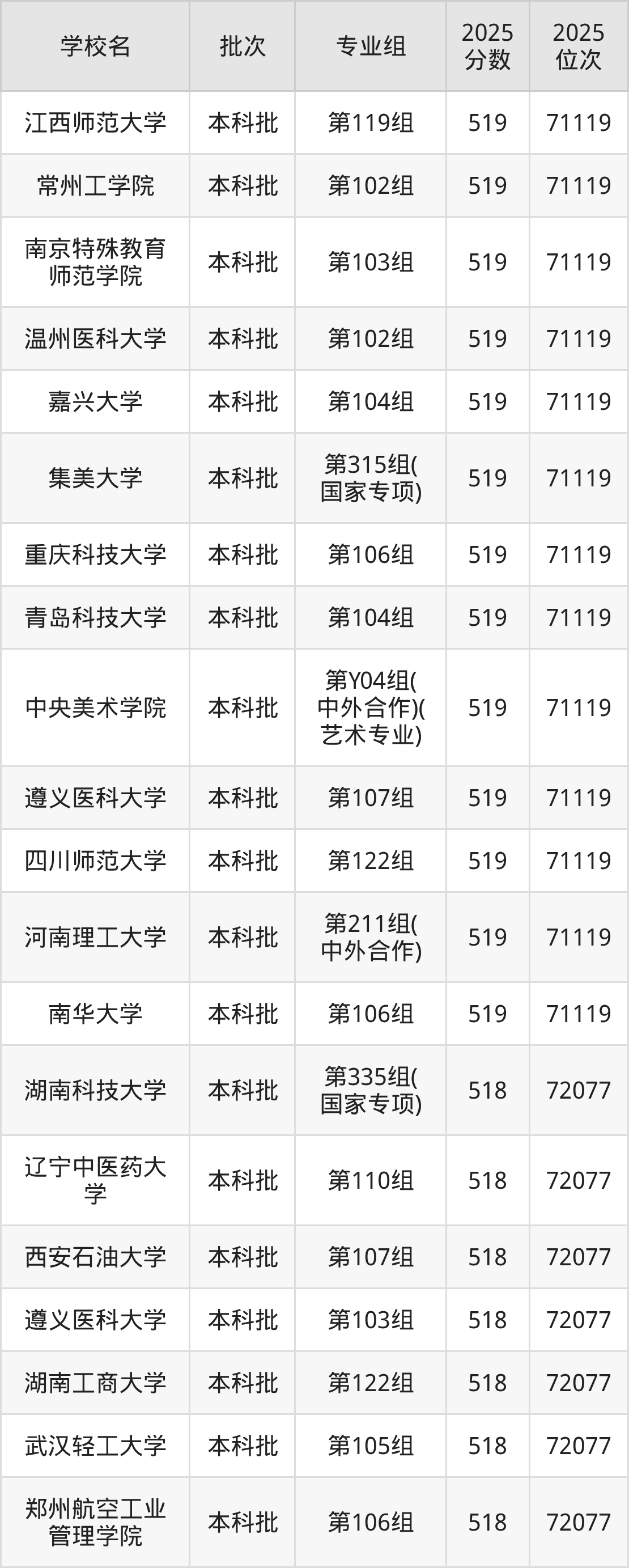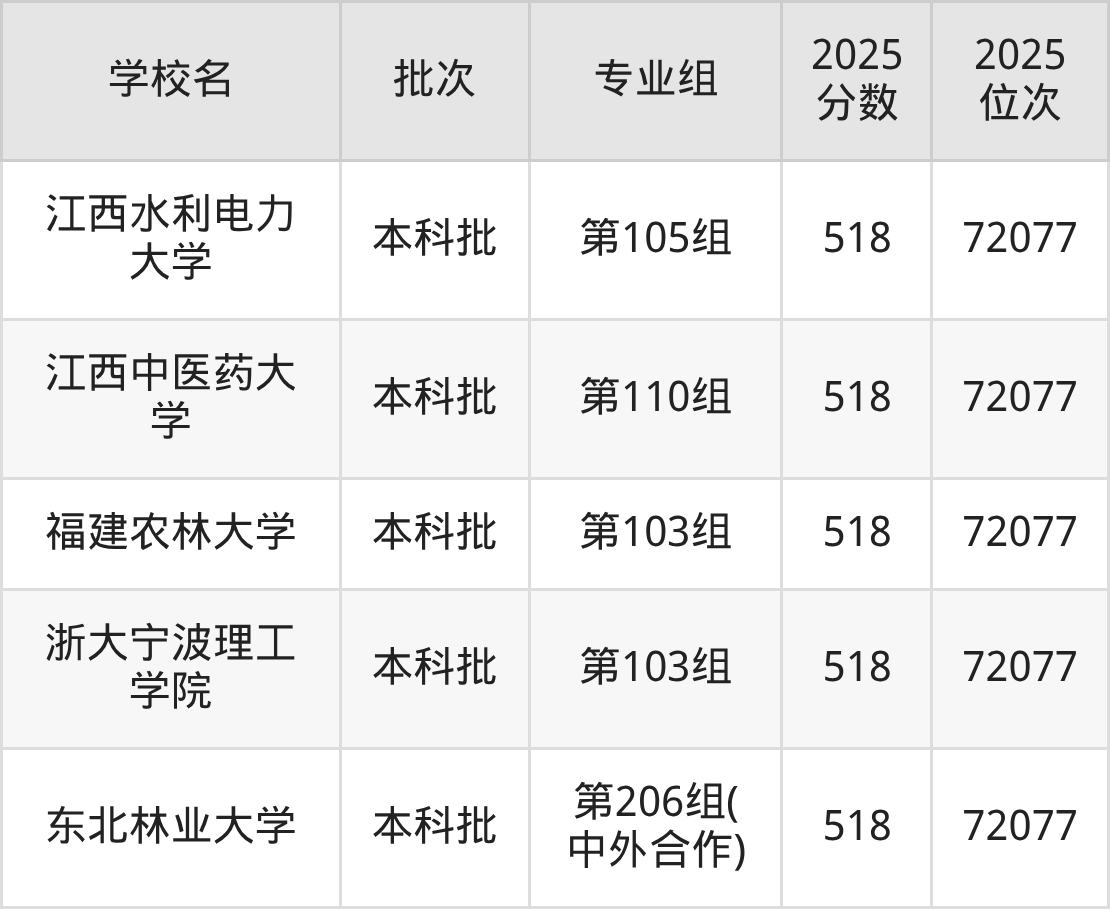 2025年湖南高考物理类518分(71120名~72077名)能上的大学有辽宁中医药大学第110组、东北林业大学第206组(中外合作)、浙大宁波理工学院第103组、福建农林大学第103组等。