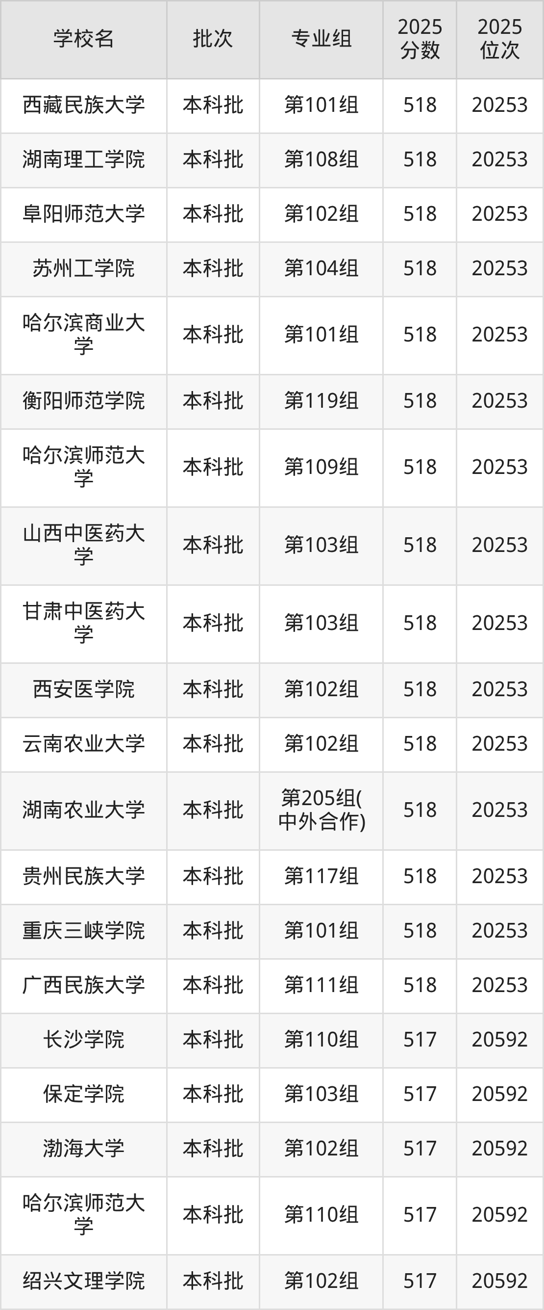 湖南高考518分:历史类排名20253位、物理类排名72077位。该分数位次对应能上的大学历史类有山西中医药大学第103组、哈尔滨师范大学第109组;物理类有辽宁中医药大学第110组、东北林业大学第206组(中外合作),更多名单如下文所示,2026届考生可参考。