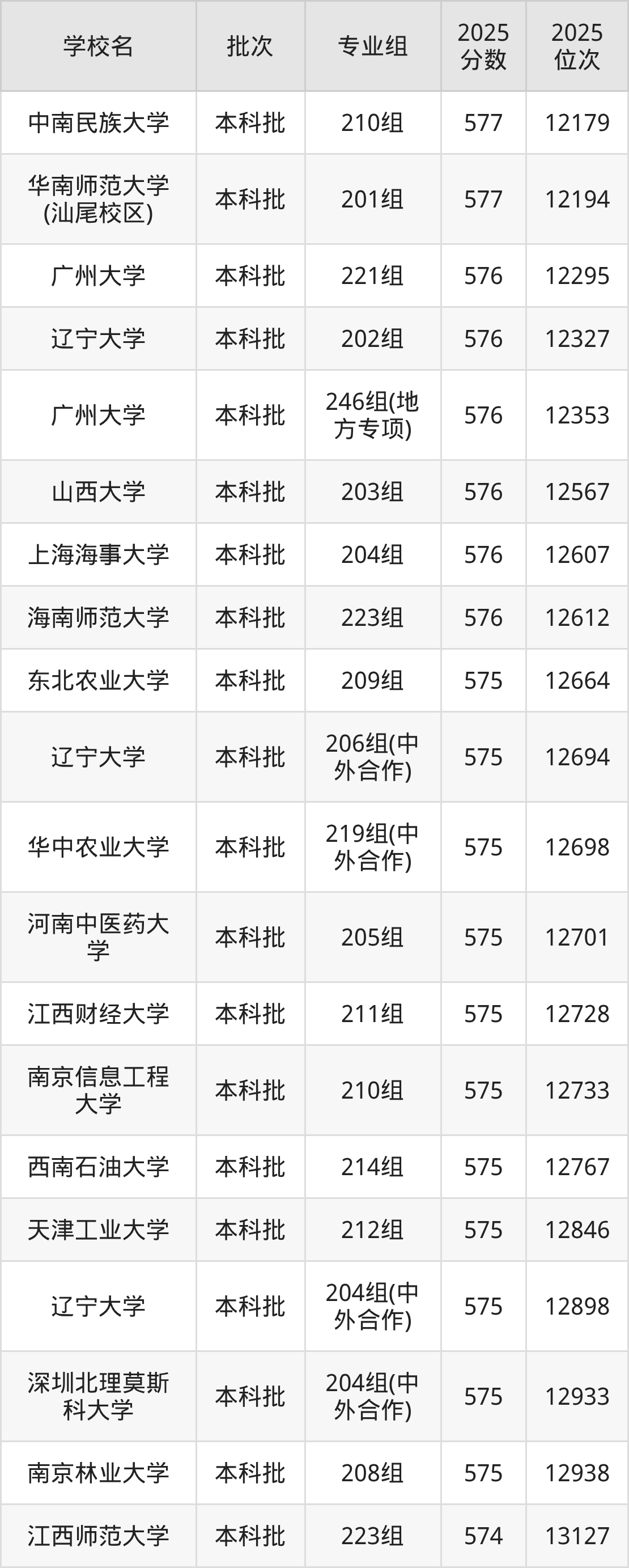 2025年广东高考历史类575分(12652名~13010名)能上的大学有天津工业大学212组、辽宁大学204组(中外合作)、辽宁大学206组(中外合作)、东北农业大学209组等。