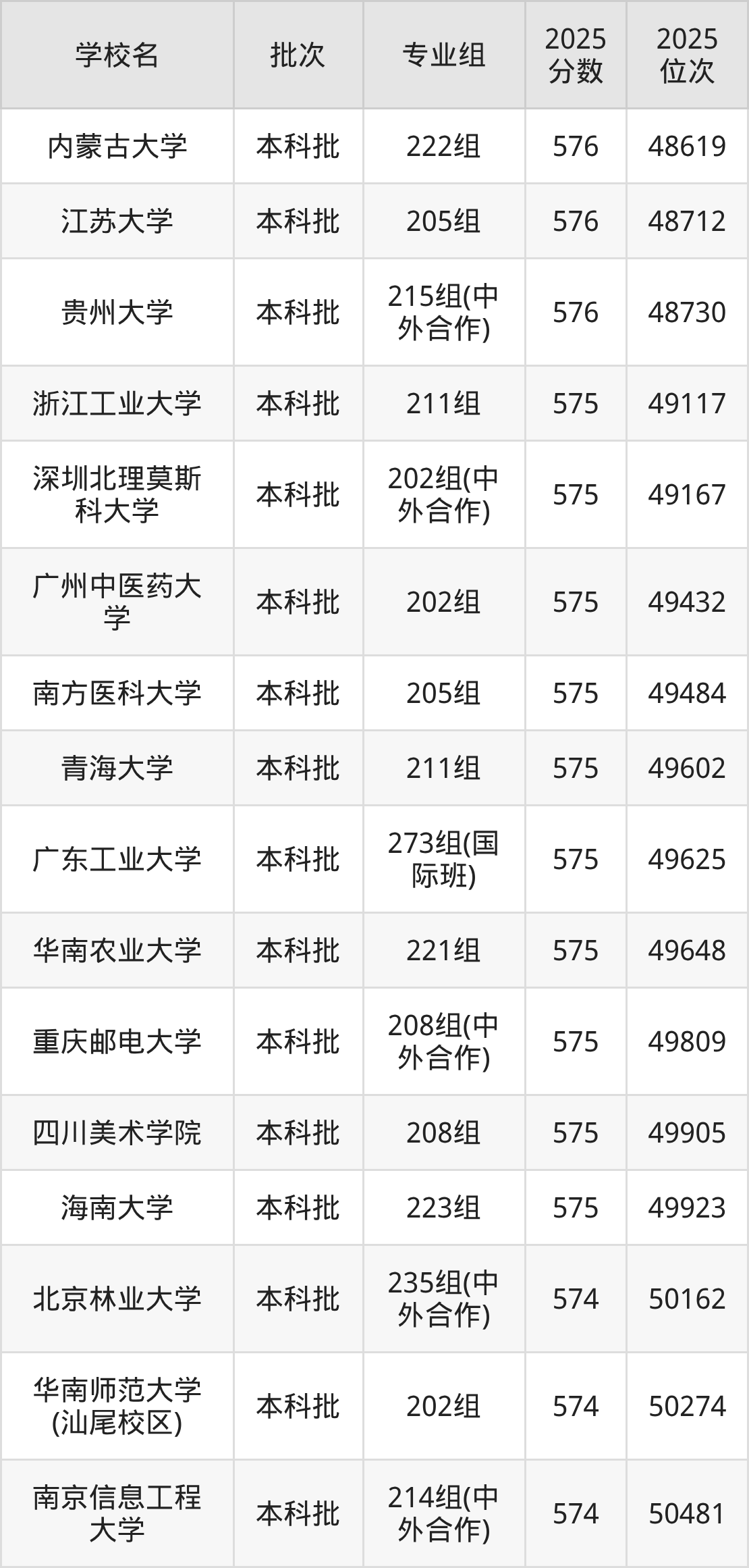 2025年广东高考物理类575分(48987名~50077名)能上的大学有浙江工业大学211组、华南农业大学221组、广州中医药大学202组、海南大学223组等。