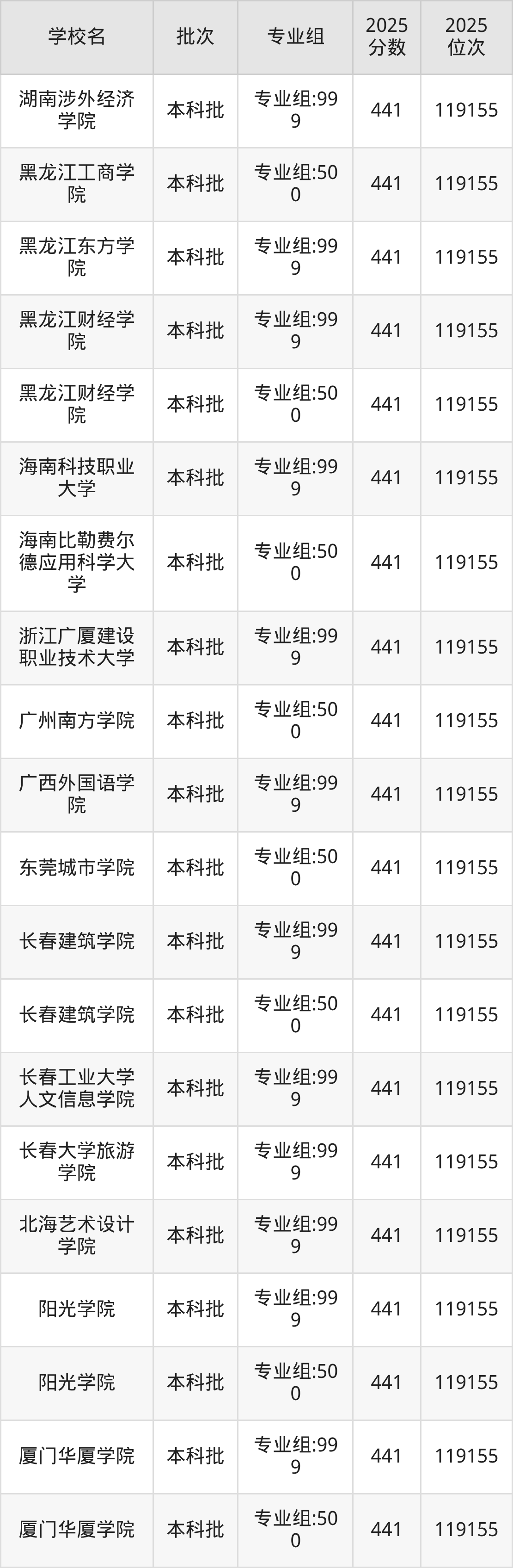 2025年福建高考历史类441分(27400名~27621名)录取位次高于该区间(可冲)的有广州新华学院专业组:999(25562名)、阳光学院专业组:999(25562名)等。