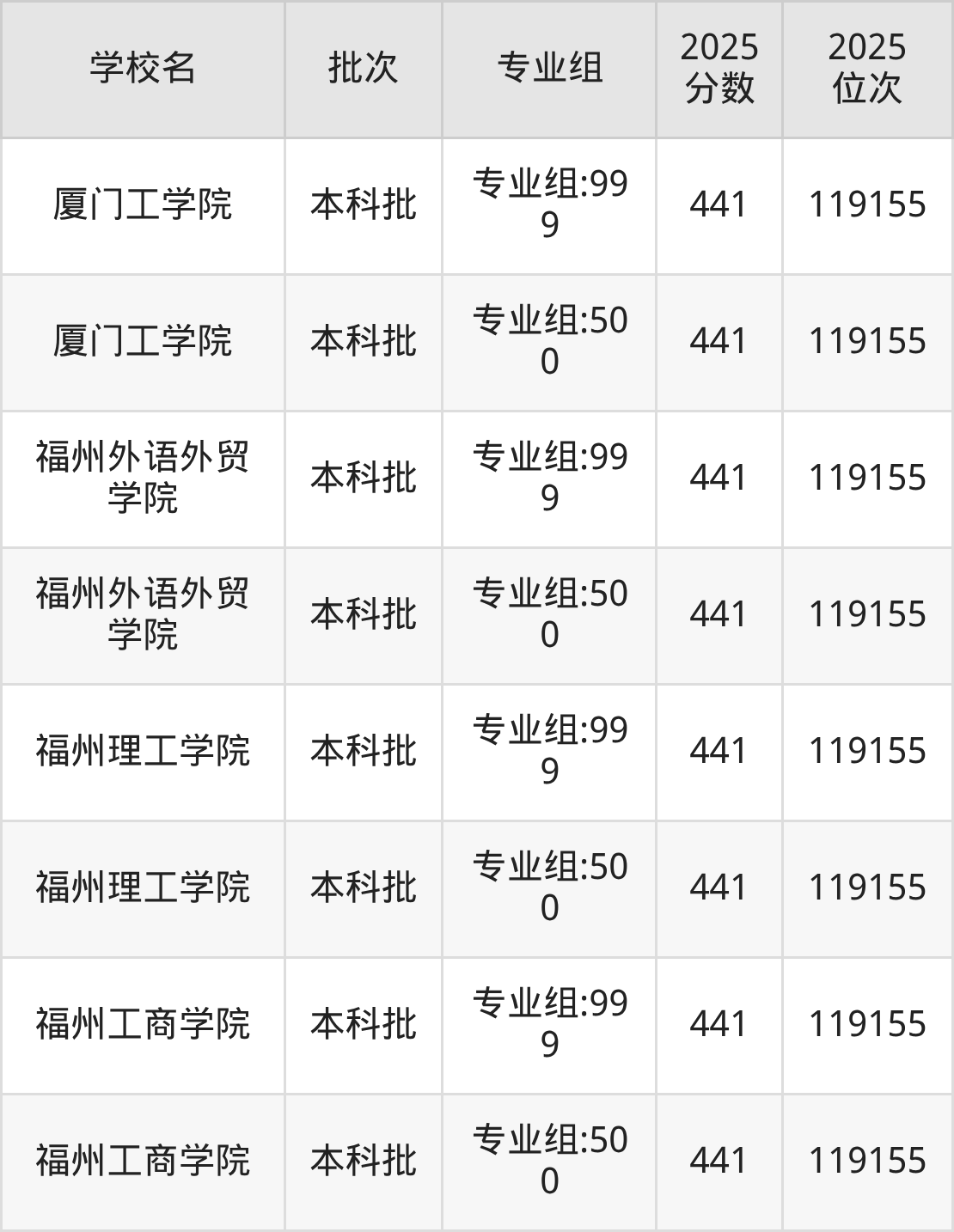 2025年福建高考物理类441分(118299名~119155名)能上的大学有福州工商学院专业组:500、福州工商学院专业组:999、福州理工学院专业组:500、福州理工学院专业组:999等。