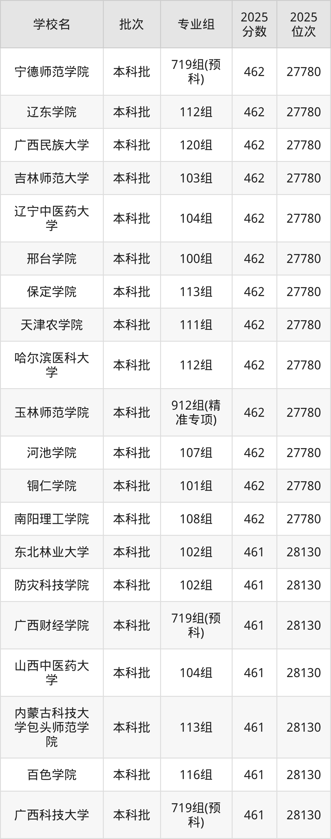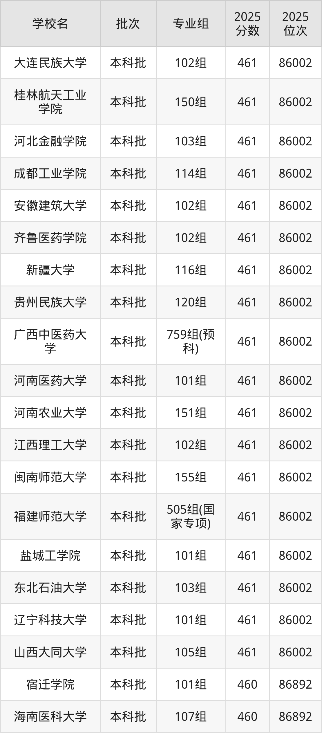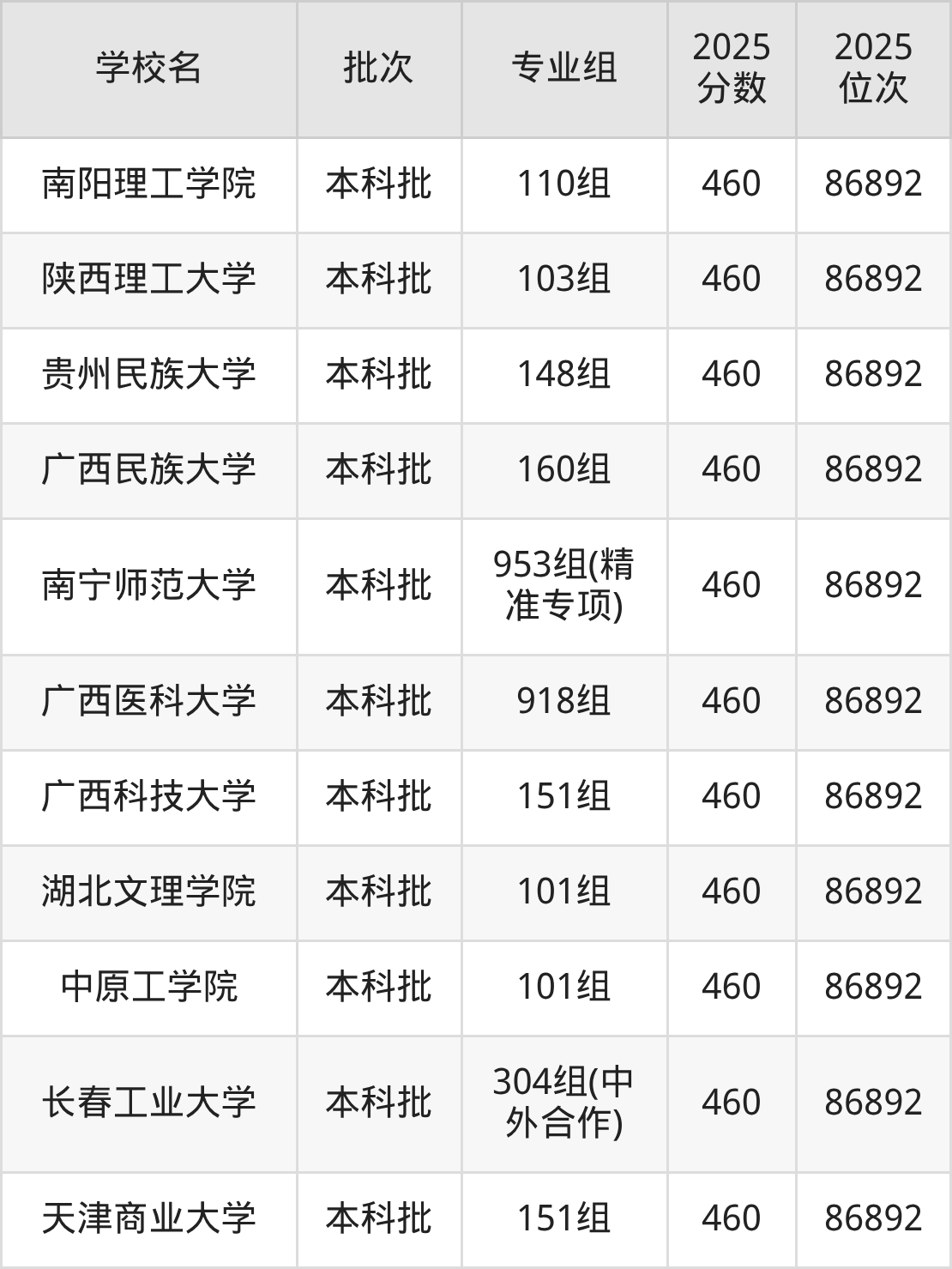 2025年广西高考物理类460分(86003名~86892名)能上的大学有天津商业大学151组、长春工业大学304组(中外合作)、中原工学院101组、湖北文理学院101组等。