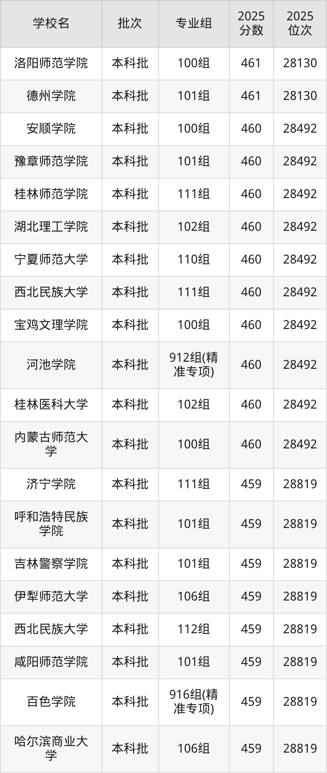 2025年广西高考历史类460分(28131名~28492名)能上的大学有内蒙古师范大学100组、桂林医科大学102组、河池学院912组(精准专项)、安顺学院100组等。
