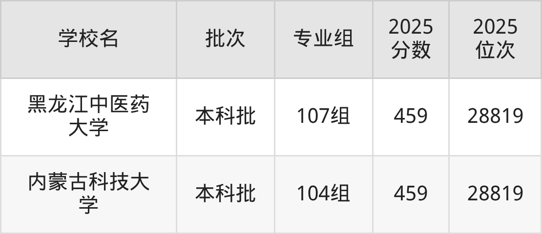 另外录取位次低于该区间(较稳妥)的有内蒙古科技大学104组(28819名)、呼和浩特民族学院101组(28819名)等;录取位次高于该区间(可冲)的有广西科技大学719组(预科)(28130名)、百色学院116组(28130名)等。
