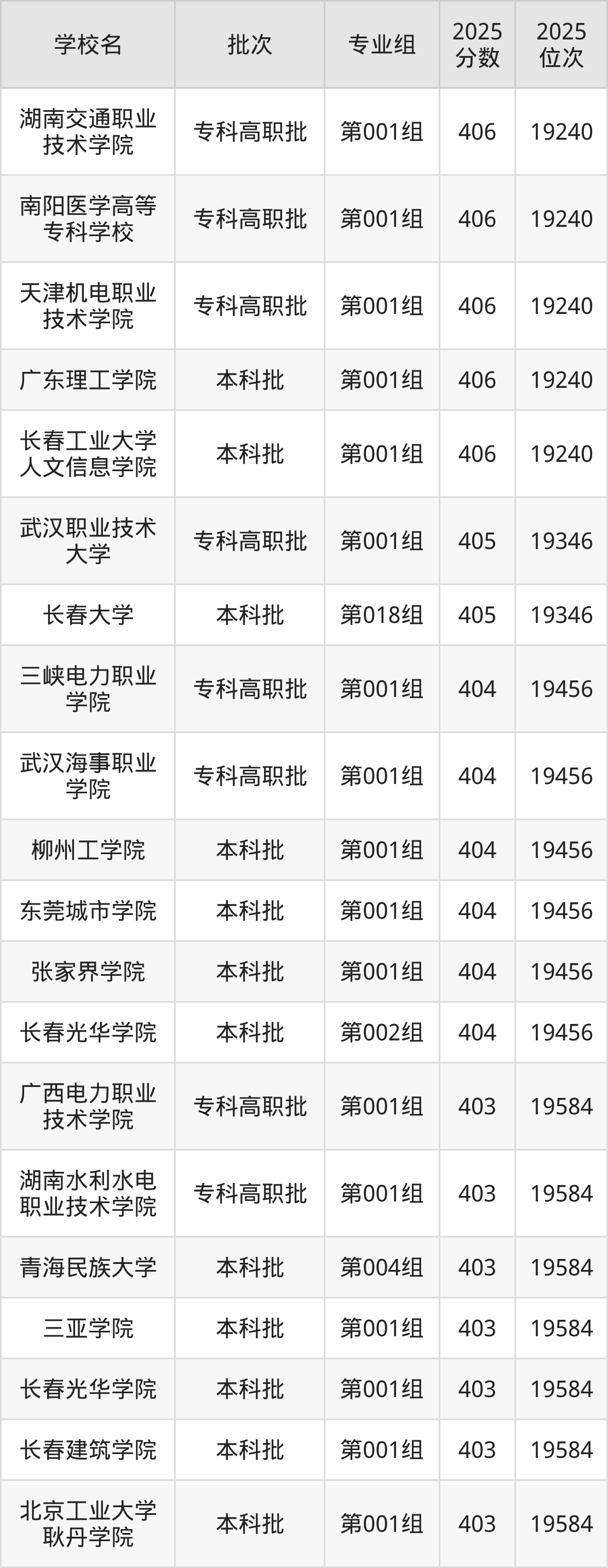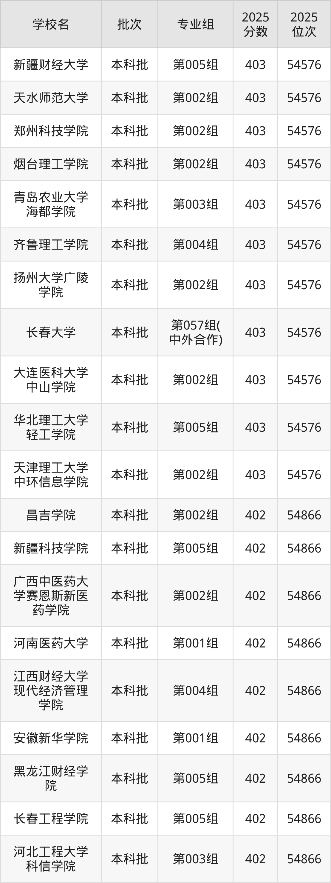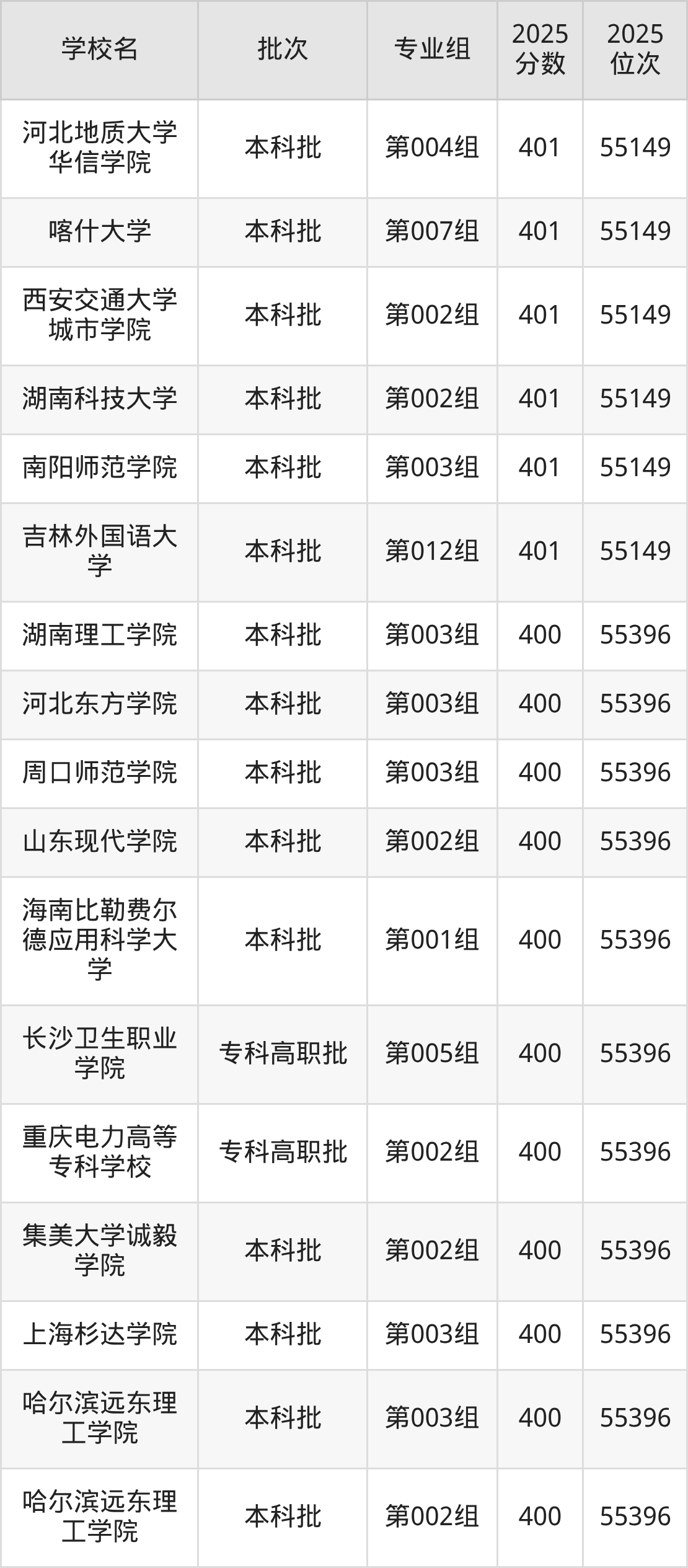 2025年吉林高考物理类401分(54867名~55149名)能上的大学有河北地质大学华信学院第004组、吉林外国语大学第012组、南阳师范学院第003组、湖南科技大学第002组等。