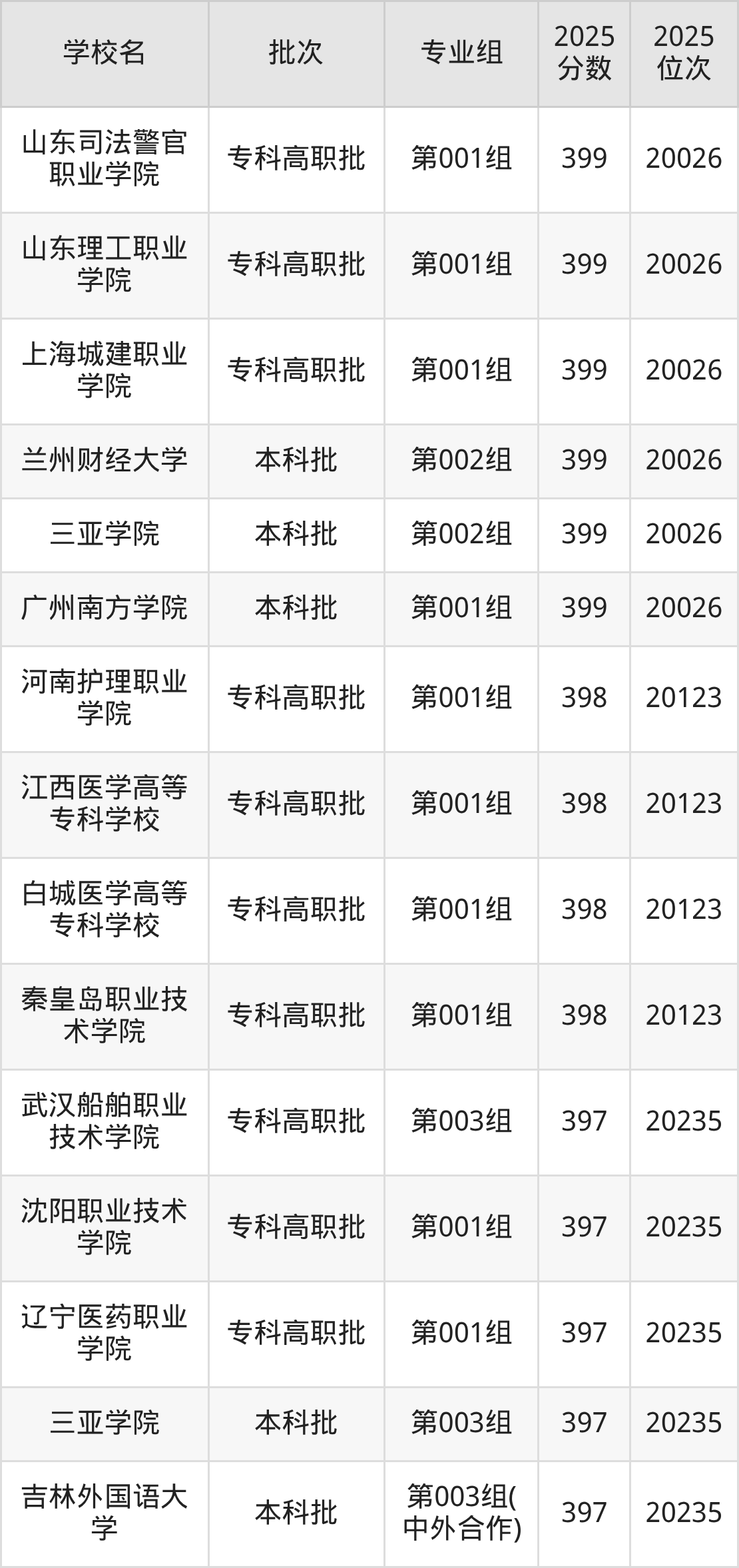 2025年吉林高考历史类401分(19695名~19807名)能上的大学有延边大学第009组、吉林师范大学博达学院第002组、长春大学旅游学院第002组、张家界航空工业职业技术学院第003组。