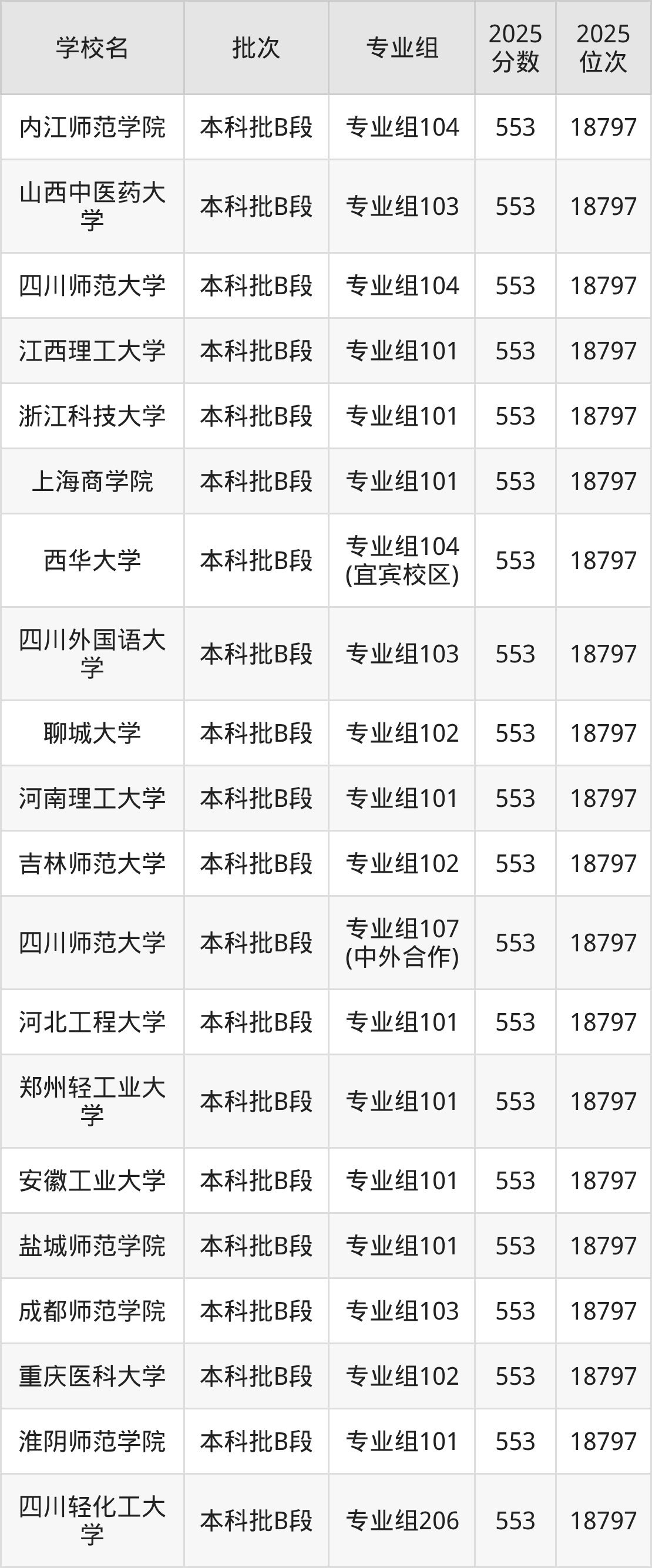 2025年四川高考历史类551分(19277名~19685名)能上的大学有山东师范大学专业组102、上海第二工业大学专业组101、四川轻化工大学专业组207、北方民族大学专业组104等。