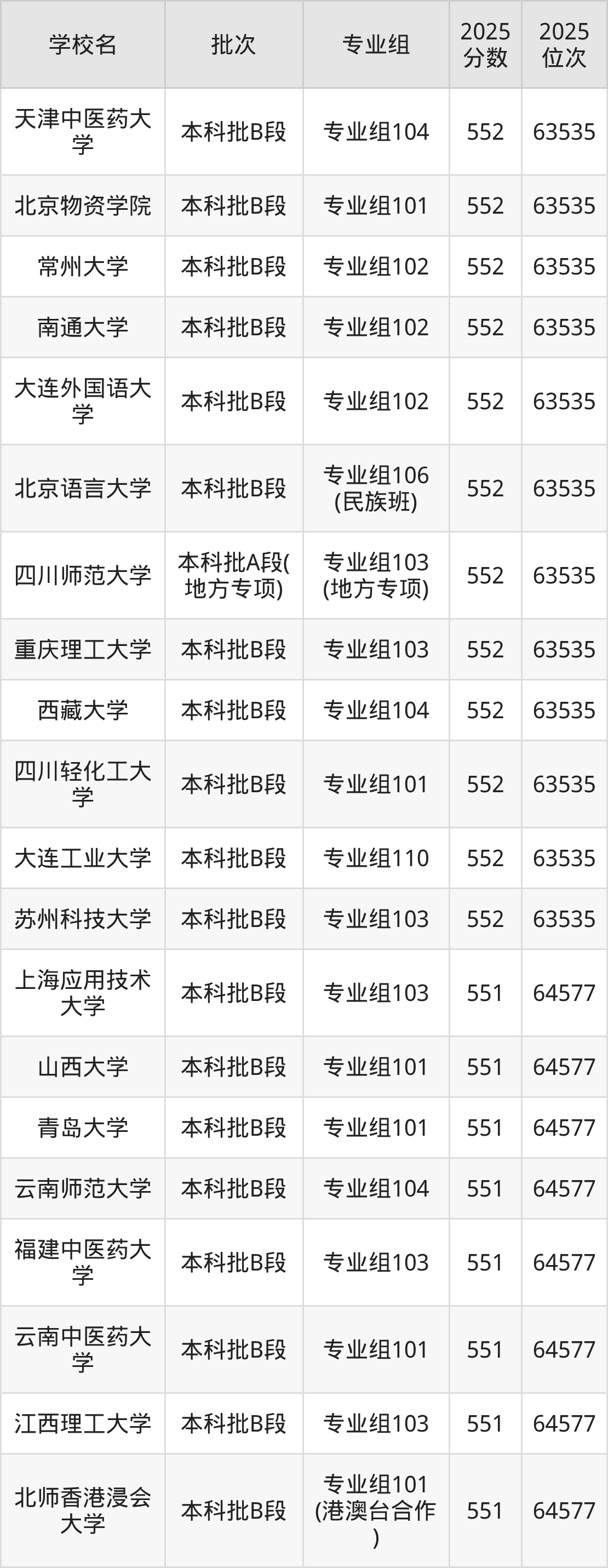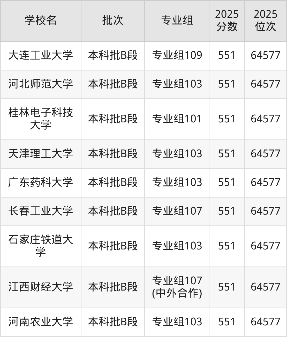 2025年四川高考物理类551分(63536名~64577名)能上的大学有江西理工大学专业组103、大连工业大学专业组109、云南师范大学专业组104、福建中医药大学专业组103等。