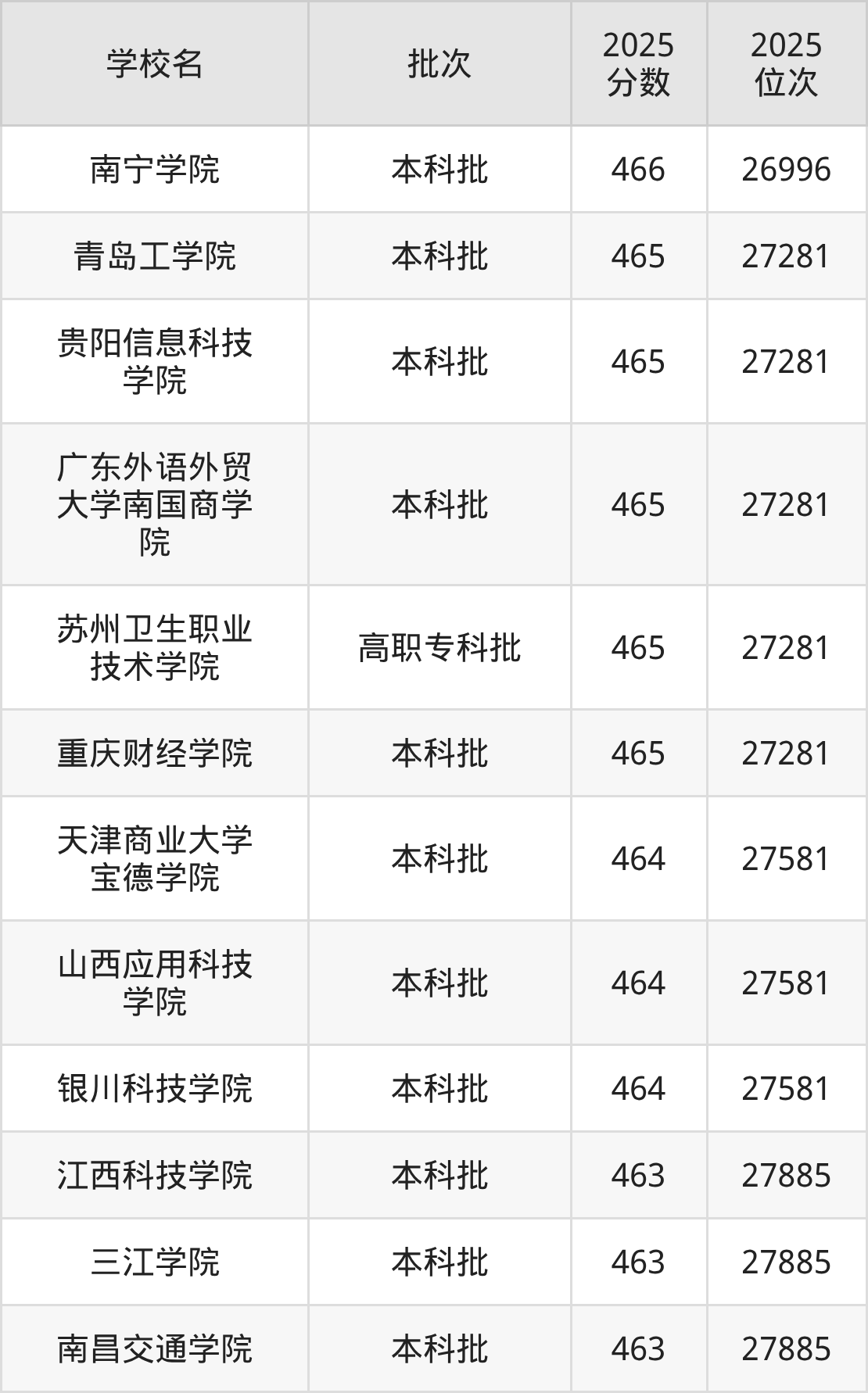 2025年重庆高考历史类464分(27282名~27581名)能上的大学有银川科技学院、天津商业大学宝德学院、山西应用科技学院。