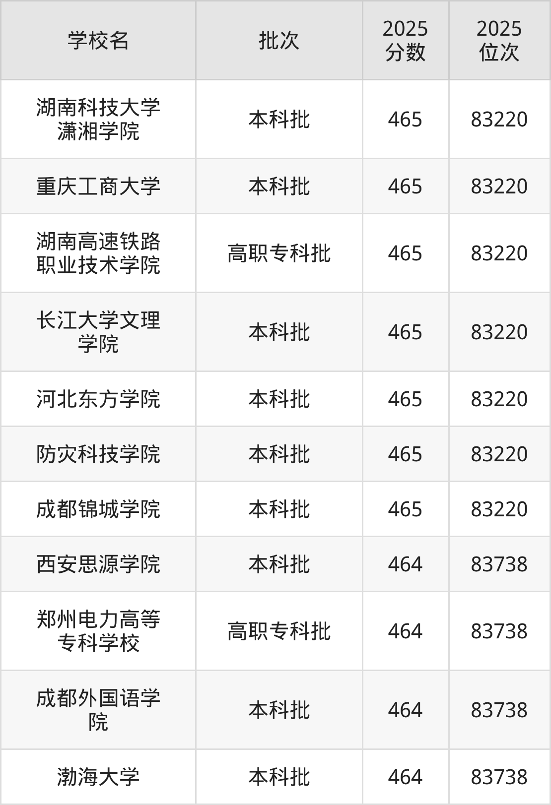 2025年重庆高考物理类464分(83221名~83738名)能上的大学有渤海大学、成都外国语学院、郑州电力高等专科学校、西安思源学院。
