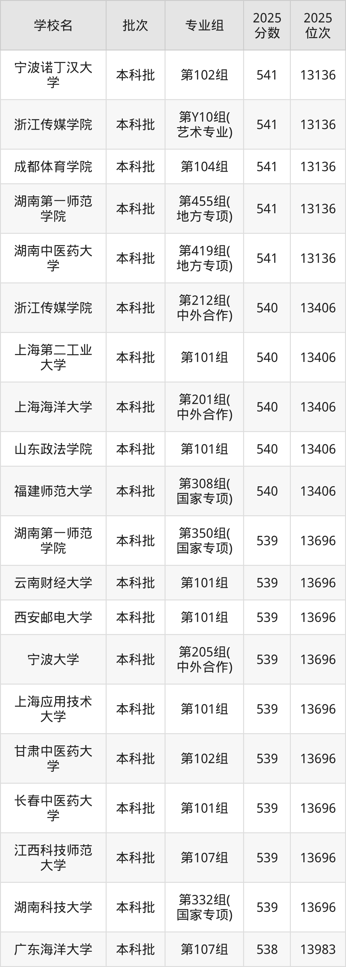 2025年湖南高考历史类539分(13407名~13696名)能上的大学有长春中医药大学第101组、上海应用技术大学第101组、宁波大学第205组(中外合作)、江西科技师范大学第107组等。