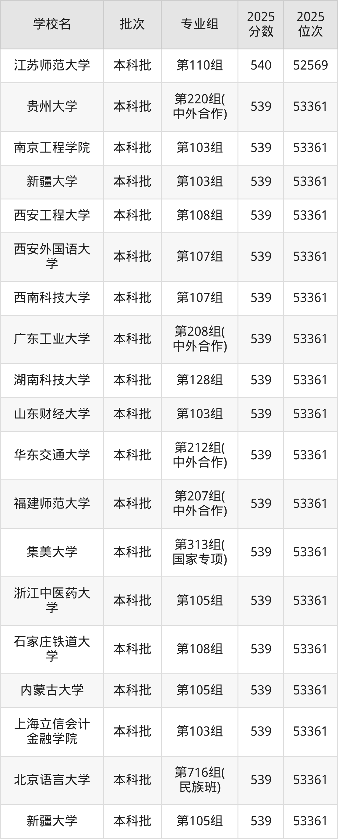 2025年湖南高考物理类539分(52570名~53361名)能上的大学有北京语言大学第716组(民族班)、石家庄铁道大学第108组、内蒙古大学第105组、上海立信会计金融学院第103组等。