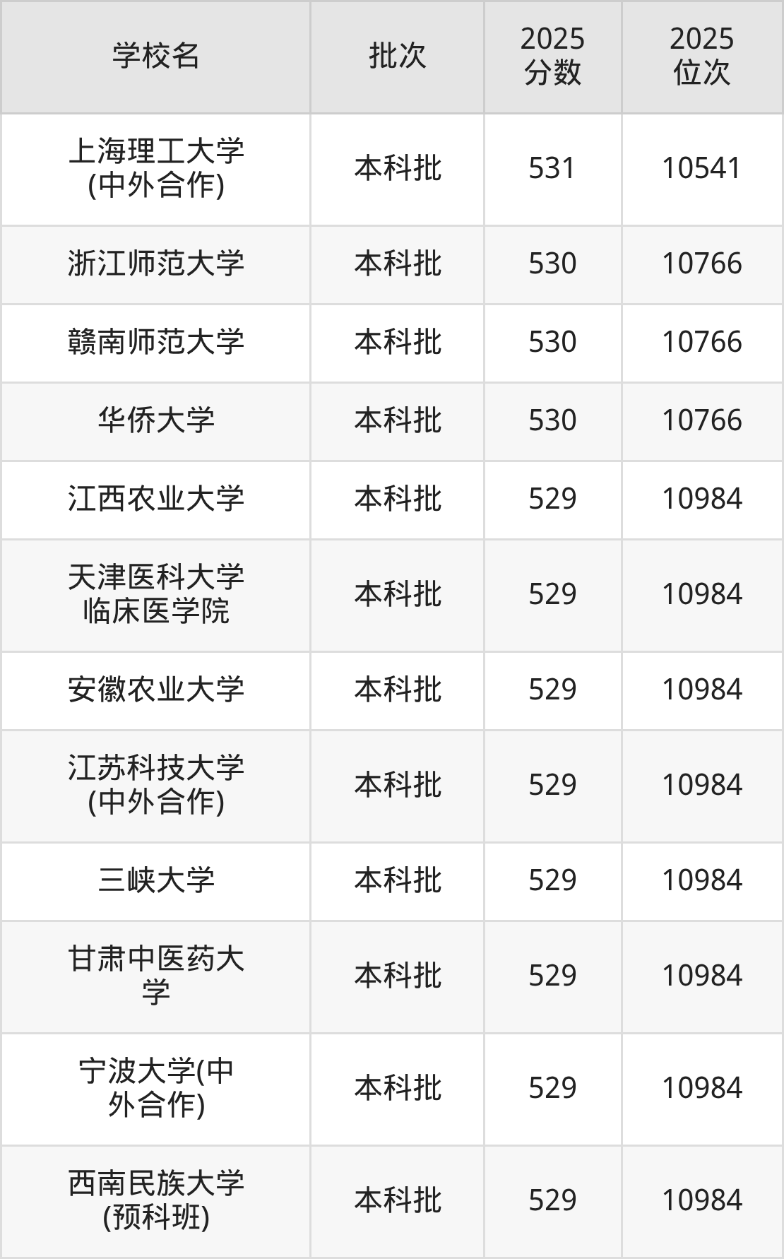 2025年重庆高考历史类531分(10339名~10541名)能上的大学有上海理工大学(中外合作)、黑龙江大学、北京物资学院、西安建筑科技大学等。