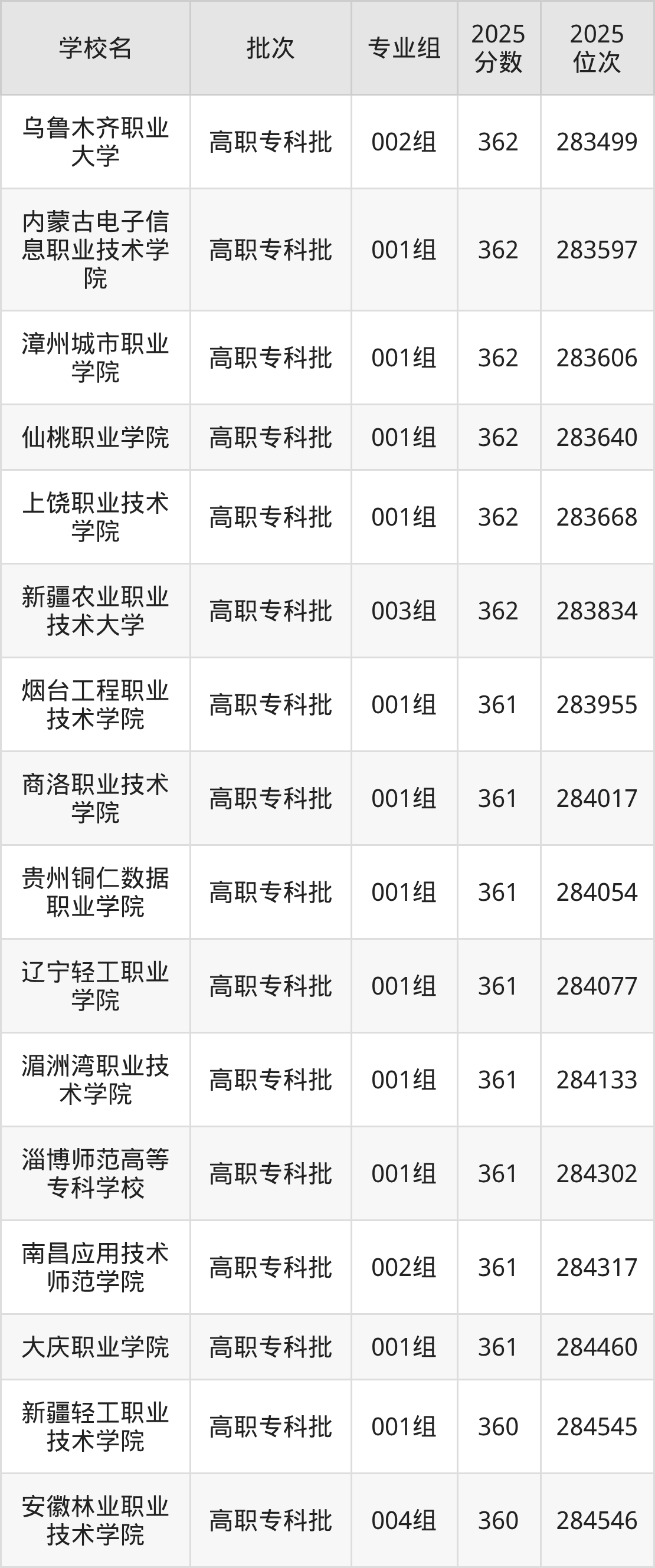 2025年安徽高考物理类361分(283951名~284514名)能上的大学有大庆职业学院001组、贵州铜仁数据职业学院001组、辽宁轻工职业学院001组、湄洲湾职业技术学院001组等。