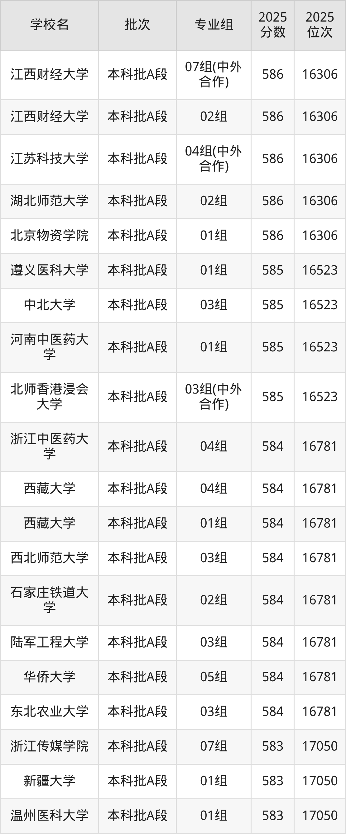 2025年天津高考584分(16524名~16781名)能上的大学有东北农业大学03组、华侨大学05组、陆军工程大学03组、石家庄铁道大学02组等。