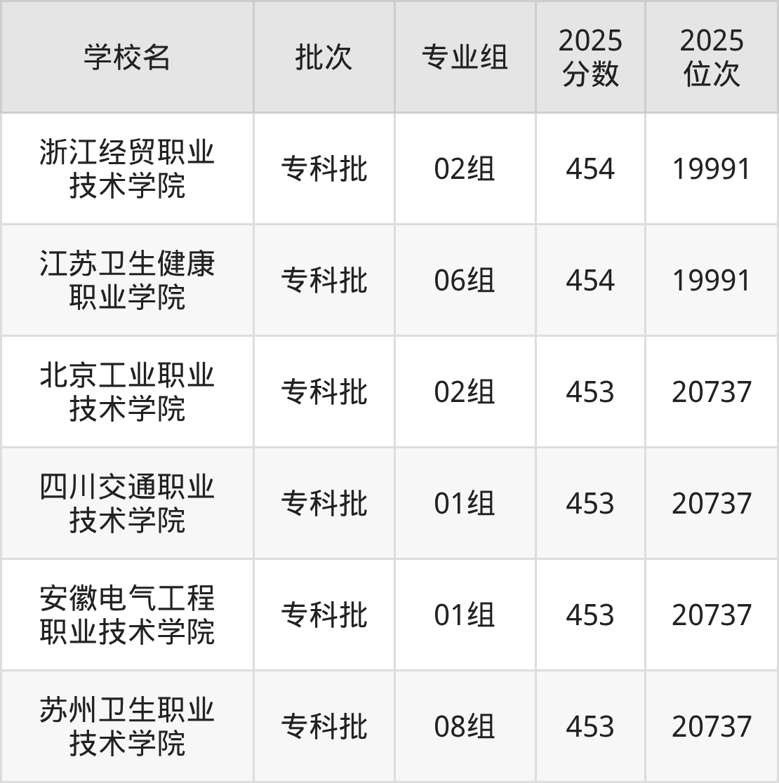 2025年江苏高考物理类453分(19992名~20737名)能上的大学有苏州卫生职业技术学院08组、安徽电气工程职业技术学院01组、北京工业职业技术学院02组、四川交通职业技术学院01组。