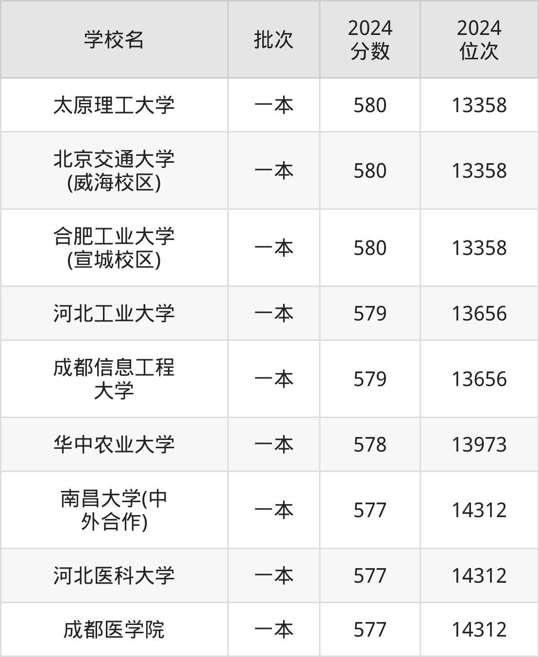 这些都是2025年高考理科13657名~13973名考生可以报考的大学,更多学校名单如下表所示: