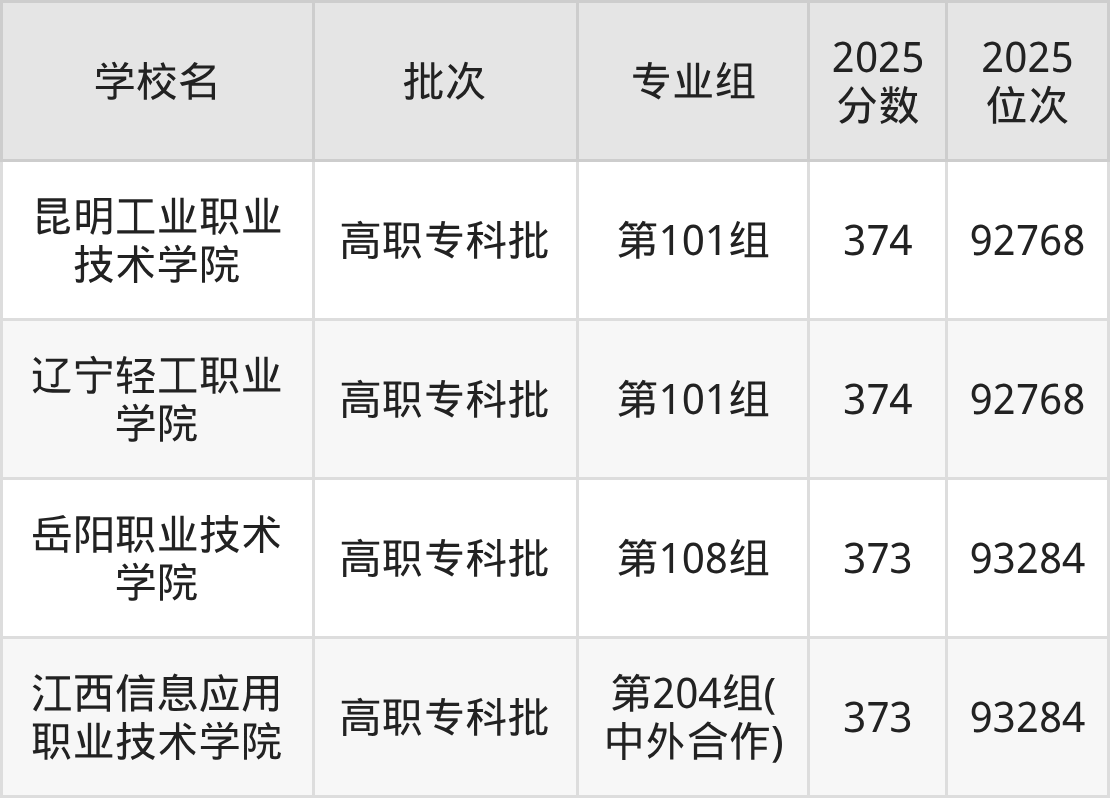 2025年湖南高考历史类373分(92769名~93284名)能上的大学有江西信息应用职业技术学院第204组(中外合作)、岳阳职业技术学院第108组。